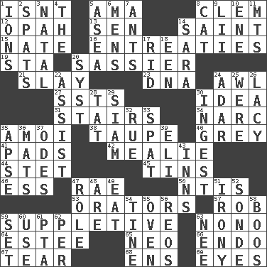 ACROSS 1. Is not 5. Wet nurse (var.) 8. Clement's nick name 12. Brightly colored fish 13. Elected rep. 14. Virtuous person 15. Nathan's nickname 16. Pleas 19. R.R. building 20. More disrespectful 21. Kill 23. Heredity factor (abbr.) 24. Leather borer 27. Fast planes 30. The content of cognition 31. Flight of steps 34. Drug cop 35. Mine, in Marseilles 38. Grayish beige 40. Jennifer or Joel 41. Groovy apts. 42. Ear of corn 44. Proofreading order 45. Canisters 46. Curvy letter 47. Actress Charlotte 50. Nuclear Threat Initiatives 53. Speakers 57. Director Reiner 59. Supplying deficiencies 63. Words to Nanette 64. First name in cosmetics 65. Modern: prefix 66. Inside; within (prefix) 67. Rend 68. Followers of ems 69. Snake ____ (dice throw) DOWN 1. Charged atoms 2. Arguments over trivial matters 3. Relating to or accompanying birth 4. Definite Article 5. Toward the sea 6. Not women's 7. Pismires 8. Feline 9. Cards in a Roman deck? 10. Compass dir. 11. Mountains (abbr.) 14. "Two Mules for Sister ____" 17. To free from 18. Car or cant ending 20. System (abbr.) 22. Help 24. The sixth month of the Jewish calendar 25. Past tense of be (plural) 26. Made of lace 28. Make lace 29. Thailand, formerly 30. Swallow 32. Regret 33. Petty quarrel 35. Domed church section 36. Floor protectors 37. Lyric poems 39. Biblical high priest 43. Lodging establishments 47. Hero or heavy, e.g. 48. "We ___ not amused" (Victoria) 49. Erode 51. Literary sarcasm 52. Message 54. Prong on a fork 55. Baking chamber 56. Vintage cars 58. Scornful sounds 59. Arrange properly for use 60. Purpose 61. Parent Teacher Association (abbr.) 62. For each 63. Born