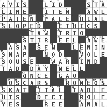 ACROSS 1. Deliberation 5. Flaplike covering 8. R.R. building 11. Actor's bit 12. Detail 14. Leather borer 15. Eucharist need 17. Diluted with white 18. Monetary unit of Yemen 19. Had an oblique or slanted direction 21. Moral principles 23. The 23rd letter of the Hebrew alphabet 25. Musical group of three 26. Commotion 27. Snakelike fish 28. Deep reverence 31. White ___ sheet 33. Elected rep. 35. Soviet premier 1918-24 37. Fastener 38. Lower and raise head in agreement 40. Short-tailed, large-bodied rat 41. Boozer 43. Armed conflict 45. Working for oneself (abbr.) 46. Bit 47. 24 hours 50. 1994 drama film starring Jodie Foster 52. Single time 53. E Mali city 54. Motion picture awards 56. Lover boys 61. Three-handed card game 62. Slanted text style (abbr.) 65. Eating place 66. Part of HMS, perhaps 67. Tenth: prefix 68. Hero or heavy, e.g. 69. Consenting reply 70. Portuguese money of account (variant) 71. Of or related to the anus DOWN 1. High mountains 2. Small bottle 3. To the inside or interior of 4. Ooze 5. Mouth edge 6. Call ___ day 7. Erase 8. Ketch in the Levant 9. It was, poetically 10. 100% 13. Distance measurement (Brit.) 16. Remaining after all deductions 18. _ de Janeiro 20. Raised platform 22. Land elevation 24. Songbird 26. Plant excrements 28. At once, immediately (arch.) 29. Rampant 30. Compass dir. 31. Small Philippine buffalo 32. Saudi Arabian king (1953-1964) 34. Immediately 36. Morally bad or wrong 37. Fast jet (abbr.) 39. Mild oath, euphamism for damn 42. Pulitzer Prize-winning author Ferber 44. Posterior 48. Sour-tasting 49. Next before 51. Spoils 52. Sep. follower 54. Migrant worker of the '30s 55. Backtalk 57. Hindu Mythology: god of death 58. Inky black, to poets 59. Water jar 60. Sew up the eyelids of hawks and falcons 61. Like a shrinking violet 63. Adept person 64. Untruth