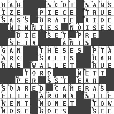 ACROSS 1. Drinking establishment 4. Highlander 8. Without 12. Ending with capital 13. Component 14. Loyal 15. Backtalk 17. Speak pompously 18. Helper 19. Simpletons 21. Annoying sounds 23. Pass on 24. Arrange properly for use 26. Before (prefix) 27. Stalk of a moss capsule 28. Pismires 30. Separate the seeds from cotton 31. College papers 34. Parent Teacher Association (abbr.) 37. Curve 38. Table seasonings 39. Rowing implement 40. Actress Charlotte 41. Place for singles 42. Sorrow 43. "Corrida" creature 44. Remaining after all deductions 46. For each 47. Fast jet (abbr.) 50. Ewer handle 51. Flew 54. Devices for capturing images 57. Writer Wiesel 58. Odor 60. Filth; sediment 62. Gone 63. Music written for nine 64. Pull behind 65. Sense of smell 66. Moves 67. Perceive with the eye DOWN 1. Twice 2. Muslim summons to prayer 3. Dwelling 4. Founders of families 5. Stop 6. Sep. follower 7. Adolescent 8. Flight of steps 9. Get up 10. Unadorned 11. Observes 13. Luau course 16. In a ____ (agitated or irritated) 20. Teachers' org. 22. Elects 25. Clothes sense 27. "Two Mules for Sister ____" 29. Egg locale 30. Slender fish 31. Russian ruler of old 32. Rings 33. Pipe bend 34. Likenesses of persons 35. Pulled tight 36. "We ___ not amused" (Victoria) 41. Had on 43. Cylindrical with tapered ends 44. Born 45. Hearing organs 46. Aches 48. Biscuitlike quick bread 49. Corrects by punishment or discipline 51. Stitched 52. Margarine 53. Mild oath, euphamism for damn 55. Floor covering 56. _ gin 59. Friend of Pooh 61. She-sheep