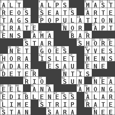 ACROSS 1. Keyboard modifier key 4. High mountains 8. Vertical spar for supporting sails 12. Vintage cars 14. Theater features 16. Johnson of "Laugh-In" 17. Labels 18. Census information 20. Feeling or showing extreme anger 22. And not 23. Fitting 24. Followers of ems 25. Nursemaid (var.) 28. Long, evenly shaped piece 30. Play the lead 31. Dinah or Pauly 35. Fish or hair follower 37. Leaves 40. Jacques Cousteau's middle name 41. Israeli folk dance 42. Small island 44. Not women's 45. The sixth month of the Jewish calendar 46. He sold his birthright 47. Compass dir. 48. Prevent from occurring 50. Nuclear Threat Initiatives 52. River (Sp.) 54. Player for Phoenix 55. Teachers' org. 58. Snakelike fish 61. Santa ___, CA 63. Amid 65. The property of being fit to eat 70. Having or resembling wings 71. Welles in "The Third Man" 72. Empty completely 73. Pace 74. Comedian Laurel of Laurel & Hardy 75. "Two Mules for Sister ____" 76. Born DOWN 1. Nick name for Arthur 2. Acquire or gain knowledge or skills 3. Ancient Roman robes 4. Cleo's killer 5. Lion 6. Infant food 7. Astound 8. Floor covering 9. Operatic vocal solo 10. Discontinue 11. Portable shelter 13. Fast jet (abbr.) 15. Oscar Madison type 19. Caspian sea tributary 21. Consume 26. Wise men 27. Came up 29. Poems 30. A viewer who gazes fixedly 32. Baking chamber 33. French philosopher Descartes 34. Double-curved letter 35. Connecting point 36. Part of Q.E.F. 38. Raised railways 39. Seines 41. Possessed 43. Ballerina skirt 49. Monetary unit of Yemen 51. _ tizzy (2 wds.) 53. Singles 55. Pitcher Ryan 56. Related on the mother's side 57. Match 58. Snakelike fish 59. Prepare for publication 60. Pale green bean 62. Pismires 64. Impair 66. Benjamin's nick name 67. Period 68. Title for a knight 69. Health resort