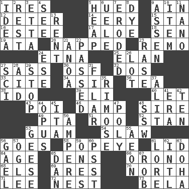 ACROSS 1. Angers 5. Took on color 9. The 18th letter of the Arabic alphabet 12. Prevent from occurring 14. Suggestive of the supernatural 15. R.R. building 16. First name in cosmetics 17. _ vera 18. Elected rep. 19. "One Day ___ Time" 20. Slept 23. San ____ (Riviera town) 24. Inactive volcano in Sicily 25. Style 27. Backtalk 30. Order of Saint Francis (abbr.) 32. Two (Sp.) 33. Quote 34. SW Saudi Arabia district 36. Afternoon social gathering 38. Wedding promise 39. Connecticut Ivy Leaguer 40. Allow 43. Luau course 46. Moist 48. Male parent of an animal 49. Parent Teacher Association (abbr.) 51. Friend of Pooh 52. Comedian Laurel of Laurel & Hardy 53. Island territory of the United States 54. Cole _ (cabbage dish) 56. Moves 58. Wimpy's pal 61. Hat (slang) 64. Mature 65. Cub Scout units 66. U. of Maine site 68. Raised railways 69. Ancient Greek god of war 70. 0 degrees 71. Area sheltered from the wind 72. A home for chicks 73. Actor Lugosi DOWN 1. The main thing one is thinking about 2. Remainder 3. Singer James 4. Observe 5. Pile 6. Ubangi River tributary 7. Eaten away 8. Color 9. NE Netherlands city 10. Detail 11. Billionth: prefix 13. Monthly bill 21. Small Philippine buffalo 22. Went by 23. Raze (variant) 24. Compass dir. 26. Car dealer's back yard 27. _-fi 28. Help 29. Constrict 31. Having threads 35. Full of chinks, cracks, or crevices 37. Came down and settled, as after flight 41. Period 42. "___ Little Indians" 44. Musical composition 45. Call ___ day 47. More than one (prefix) 48. Compass dir. 50. Electrical Unit 53. Honkers 55. Age 56. Highlander 57. Stare at amorously 59. Singles 60. Inconspicuous attention getter 61. Old wives' tales, e.g. 62. International (abbr.) 63. Capital of the state of Qatar 65. One of the 12 tribes of Israel 67. Director Reiner