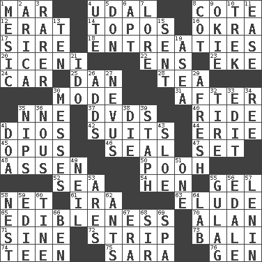 ACROSS 1. Third mo. 4. Hereditary estate 8. ____ d'Azur (French Riviera) 12. Part of Q.E.F. 14. Traditional theme or motif 16. Gumbo ingredient 17. Father 18. Pleas 20. Ancient Celtic tribe of eastern Britain 22. Followers of ems 23. Supplement with great effort 24. 4-wheeled motor vehicle 25. One of the 12 tribes of Israel 28. Beverage made from leaves 30. Method 31. Following 35. Compass dir. 37. Movie discs 40. Travel on an animal 41. "Vaya con ____" 42. Costumes for special activities 44. 4th largest of the Great Lakes 45. Musical composition 46. Lick closed 47. Put into a specified state 48. NE Netherlands city 50. "Silly old bear" 52. Ocean 54. Layer 55. Set 58. Fish or hair follower 61. Lyricist Gershwin 63. Evade 65. The property of being fit to eat 70. ____ Jay Lerner 71. Trig term 72. Long narrow piece of something 73. Indonesian resort city 74. Adolescent 75. "Two Mules for Sister ____" 76. Commissioned military rank (abbr.) DOWN 1. Mesonic 2. N. Chile seaport 3. More valued for its uncommonness 4. Shoshoni 5. Spanish title 6. Fitting 7. Old wives' tales, e.g. 8. Small bed 9. Migrant worker of the '30s 10. Long journey 11. Comfort 13. Nine, plus one 15. Transmitted 19. At sea 21. Wedding promise 26. Sums up 27. Mole, birthmark 29. Anew 30. Makes clutter 32. Hoop that covers a wheel 33. Prepare for publication 34. Portuguese money of account (variant) 35. Pinches, bites 36. Common sense 38. Expire 39. Staphylococcus 41. ___ good deed 43. _ gin 49. Famous astronaut Armstrong 51. Single 53. Ancient Greek god of war 55. Russian prison camp 56. Peak District village in England 57. Soviet premier 1918-24 58. Egg locale 59. Singer Brickell 60. Prong on a fork 62. Pismires 64. Experiment locale 66. Benjamin's nick name 67. Epoch 68. Title for a knight 69. Health resort