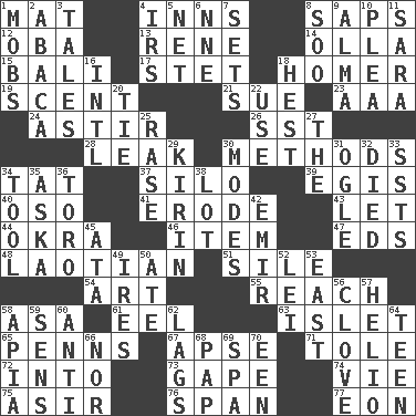 ACROSS 1. Floor protector 4. Restaurants 8. Plant excrements 12. Chief or king in Benin or Nigeria 13. French philosopher Descartes 14. Water jar 15. Indonesian resort city 17. Proofreading order 18. Baseball hit which scores a run 19. Odor 21. Institute legal proceedings 23. American Automobile Association (abbr.) 24. Having gotten out of bed 26. Fast jet (abbr.) 28. Path through which fluid escapes 30. Modes 34. Make lace 37. Grain storage tower 39. The front part of a cuirass 40. Bear (Spanish) 41. Wear away 43. Allow 44. Gumbo ingredient 46. Detail 47. Begley and Asner 48. Of or relating to Laos or its people 51. Drop; flow; fall 54. Tate display 55. Arrive at 58. White ___ sheet 61. Snakelike fish 63. Small island 65. Actor Sean's family 67. Domed church section 71. Lacquered or enameled metalware 72. To the inside or interior of 73. Open wide 74. Compete 75. SW Saudi Arabia district 76. Connect, as a bridge 77. A really long time DOWN 1. Disorderly crowds 2. Phillipine bananalike plant 3. Stories 4. Big collection agency 5. Fish or hair follower 6. Compass dir. 7. Puts into a specified state 8. "Barney Miller" actor Jack 9. _ mater 10. Entreaty 11. "Two Mules for Sister ____" 16. International (abbr.) 18. Command 20. Make a knot 22. Purpose 25. To erase 27. Definite Article 29. Japanese brewing company 30. Methods 31. Stare 32. Passed on 33. Fast planes 34. Implement 35. "____ silly question..." 36. "Corrida" creature 38. Car dealer's back yard 42. Arab leader 45. "One Day ___ Time" 49. Angers 50. Had dinner 52. Luau accessory 53. 90 degrees 56. Garlic unit 57. Sun: prefix 58. Capital of Western Samoa 59. Elected reps. 60. Opposed to 62. Fails to keep up a pace 64. Adolescent 66. Or not 68. Infant food 69. Health resort 70. Car or cant ending