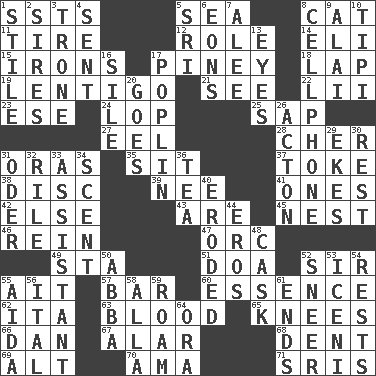 ACROSS 1. Fast planes 5. Ocean 8. Domesticated feline 11. Hoop that covers a wheel 12. Hero or heavy, e.g. 14. Biblical high priest 15. Removes the wrinkles 17. Abounding in pines 18. Infant locale 19. Small, flat, pigmented spot on the skin 21. Perceive with the eye 22. Cards in a Roman deck? 23. Compass dir. 24. Trim (branches) 25. Plant excrement 27. Snakelike fish 28. "Mermaids" star 31. Mouths or openings 35. Be seated 37. Puff or smoke 38. Flat circle 39. Born 41. Singles 42. Otherwise 43. "We ___ not amused" (Victoria) 45. A home for chicks 46. It's straight from the horse's mouth 47. The grampus (Milton) 49. R.R. building 51. ___ good deed 52. Title for a knight 55. Small island 57. Oblong piece of solid material 60. Gist 62. Call ___ day 63. Vital fluid 65. Leg joints 66. One of the 12 tribes of Israel 67. Having or resembling wings 68. Gouge 69. The first octave above the treble staff 70. Nursemaid (var.) 71. Indian titles of respect DOWN 1. Vertical member of a panel or frame 2. Titles for men of rank and authority 3. Heavy duty weighing machine 4. Emitted 5. _ Lanka 6. Immeasurably long periods of time 7. Toward shelter 8. Portable communications device 9. Mountain range southwest of Kyrgyzstan 10. Native american tent (variation) 13. Snake ____ (dice throw) 16. Drop; flow; fall 17. Cotton for raincoats, e.g. 20. Travels 26. Gambison 29. Makes supply last 30. Respite 31. River in Europe 32. Cause heat under the collar 33. Helper 34. Odor 36. Afternoon social gathering 40. Worn away 44. Greek god of love 48. Keg 50. Swedish rock group 52. Contemptuous expression 53. Ancient Celtic tribe of eastern Britain 54. Musical pauses 55. Opera by Verdi 56. Slanted text style (abbr.) 58. Silent film actress Nazimova 59. Wander aimlessly 61. Extremities 64. Mouth or opening