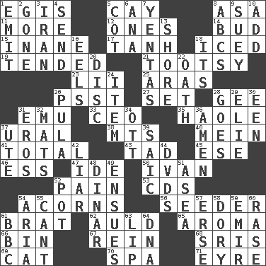 ACROSS 1. The front part of a cuirass 5. Island 8. White ___ sheet 11. Greater amount 12. Washington bills 14. Partially opened flower 15. Empty; void 17. Hyperbolic tangent 18. On the rocks 19. Watched over 21. A girl or young woman (variant) 23. Cards in a Roman deck? 25. Ancient river in northeast Turkey 26. Inconspicuous attention getter 27. Arrange properly for use 28. Unit of force equal to gravity 31. Australian flightless bird 33. Corporate head (abbr.) 35. White Person, in Hawaii 37. Mountain range 38. Mountains (abbr.) 40. Chow _ 41. "_____ Recall" 43. Small amount or degree 45. Compass dir. 46. Curvy letter 47. Binary compound 50. "Terrible" tsar 52. Ache 53. Music discs 54. Oak nuts 56. Sowing specialist 61. Naughty child 62. Old (Scot.) 65. Odor 66. Storage container 67. It's straight from the horse's mouth 68. Indian titles of respect 69. Feline 70. Health resort 71. Jane of fiction DOWN 1. Give off 2. Went 3. SW Asia republic 4. Post 5. Small bed 6. Santa ___, CA 7. Gossips 8. Lettered men learn these first 9. Chop _ 10. Find the sum of 13. Dinah or Pauly 16. Snakelike fish 18. ___ a Wonderful Life 20. Compact _ 22. Pledge 24. A whole individual unit 26. Monetary unit of Botswana 28. Travels 29. Writer Wiesel 30. Car or cant ending 31. Greek god of love 32. Floor protectors 34. Baseball player Mel 36. So be it 37. Shoshoni 39. Ketch in the Levant 42. One who doesn't tell the truth 44. Movie discs 48. Middle Eastern gold or silver currency 49. Follows as a consequence or result 51. Toward the sea 52. Plant holder 54. Operatic vocal solo 55. Patter 57. Celtic language 58. Rowboat 59. Independent ruler or chieftain 60. To erase 61. English channel? 63. Mouth edge 64. Heredity factor (abbr.)