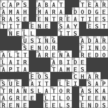 ACROSS 1. Smile enhancers 5. Blind as ____ 9. Pull into pieces 13. Nursemaid 14. Hindu Mythology: god of death 15. Evade 16. To erase 17. Pleas 19. Teat (slang) 20. Compass dir. 21. Declare 22. Eastern Standard Time (abbr.) 23. 1994 drama film starring Jodie Foster 25. ___ a Wonderful Life 26. Putting into practice 30. The sixth month of the Jewish calendar 34. Sir (Sp.) 35. Fine (Spanish) 36. Set down 39. Sports stadium 42. Do over again 43. Den 44. Tolerate 46. Capital of Western Samoa 47. Softens 48. Greek goddess of the dawn 51. Burn to charcoal 54. Institute legal proceedings 57. Small island 58. Flowery wreath 60. Plant excrement 62. Interpreter 65. "____ silly question..." 66. Match 67. _ and Stitch 68. Adolescent 69. French philosopher Descartes 70. Snakelike fish 71. Extremities DOWN 1. Draw slowly or heavily 2. At full speed 3. Thick mixture 4. A female animal or person 5. So be it 6. Object of repulsion 7. Nonscientific branch of learning 8. Tarsus (plural) 9. Small child 10. Singer Brickell 11. Eons 12. Remainder 15. 24-hour periods 18. Ingest 20. Otherwise 24. A period of five years 27. _ tizzy (2 wds.) 28. Or not 29. Relatively large 30. Anew 31. Pass on 32. Also 33. Friend of Pooh 36. Chicken ___ king 37. Pet locale 38. One more than two 40. Basketball assoc. 41. Direct toward a target or goal 45. Tenth: prefix 48. Relaxation 49. Petroleum 50. Lacking originality or spontaneity 52. NE Netherlands city 53. Moved through 54. Play the lead 55. Goad 56. Merit 58. Hang loosely or laxly 59. Greek god of love 61. Baking dishes 63. Born 64. Make a knot 65. Had dinner