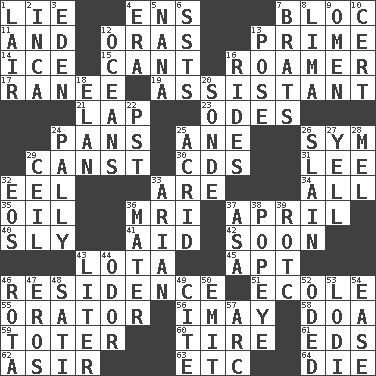 ACROSS 1. Untruth 4. Followers of ems 7. Group of countries in special alliance 11. Also 12. Mouths or openings 13. First class 14. Frozen water 15. Patter 16. Nomad 17. Indian princess (variant) 19. Aide 21. Pet locale 23. Lyric poems 24. Baking dishes 25. One (Scot) 26. Symbol (abbr.) 29. 2nd pers. sing. pres. of can (arch.) 30. Music discs 31. Area sheltered from the wind 32. Snakelike fish 33. "We ___ not amused" (Victoria) 34. 100% 35. Petroleum 36. Medical imaging device (abbr.) 37. Showery time 40. Cunning 41. Help 42. Within a short period 43. Globular water bottle used in Asia 45. Fitting 46. Dwelling 51. Learning spot: Fr. 55. Speaker 56. "If ____ say so..." 58. ___ good deed 59. Carrier 60. Hoop that covers a wheel 61. Begley and Asner 62. SW Saudi Arabia district 63. And so on (abbr.) 64. Expire DOWN 1. Den 2. South American Indian 3. Locale of original sin 4. Period 5. Grandmother 6. Fast planes 7. Naughty children 8. Pale green bean 9. Presage 10. Foregone conclusion 12. Seas 13. Introduce or present, as a question 16. Amusement-park features 18. Style 20. Something which is sent 22. Pacific Standard Time (abbr.) 24. Friendly 25. Bitter 26. Killed 27. Shout 28. Cartoonist voice _ Blanc 29. To provide with a ceiling 32. Greek goddess of the dawn 33. Believer in; advocate of (suffix) 36. Mother 37. White ___ sheet 38. Wimpy's pal 39. College mil. group 43. 61 cubic inches 44. Aroma 46. Round or rotation of duties 47. Greek god of love 48. Suttee (variant) 49. Quote 50. Send forth 52. Wrote a lyric poem 53. Farming town in central California 54. Relaxation 57. Curve