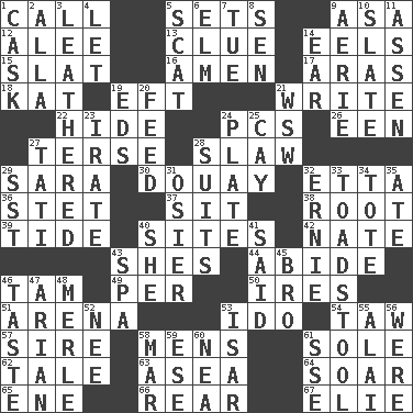 ACROSS 1. Give a ring to 5. Puts into a specified state 9. White ___ sheet 12. Toward shelter 13. A slight indication 14. Snakelike fish 15. Narrow board 16. So be it 17. Ancient river in northeast Turkey 18. Krazy ___ of comics 19. Bank Draft (abbr.) 21. Compose 22. Flintstone garb 24. Personal Computers (abbr.) 26. Car or cant ending 27. Laconic 28. Cole _ (cabbage dish) 29. "Two Mules for Sister ____" 30. A city in N France, SE of Calais 32. Singer James 36. Proofreading order 37. Be seated 38. Carrot, for example 39. Event that recurs at intervals 40. Settings 42. Nathan's nickname 43. "______ My Girl" (Turtles hit) 44. Remain 46. Scottish cap 49. For each 50. Angers 51. Sports stadium 53. Wedding promise 54. The 23rd letter of the Hebrew alphabet 57. The founder of a family 58. Not women's 61. Not divided or shared with others 62. Lie 63. Toward the sea 64. Fly high 65. Compass dir. 66. Bring up, as a child 67. Writer Wiesel DOWN 1. Keg 2. Silent film actress Nazimova 3. Resembling or made to resemble leather 4. Allow 5. Scram, to a cat 6. Shade tree 7. Third day of the wk. 8. Elected rep. 9. Nest on high 10. Chalkboard 11. NE Netherlands city 14. Hearing organ 19. Begley and Asner 20. Nourish 21. Compass dir. 23. Feeling or showing extreme anger 24. Food holder 25. Island 27. Jacques of French films 28. Sets or collections 29. Fast jet (abbr.) 31. Flexible twig of a willow tree 32. Bert's buddy 33. Inedible or poisonous agaric 34. Haul 35. Had dinner 40. A female animal or person 41. Alleged 43. Health resort 45. Sis' sibling 46. Clothes sense 47. Believer in; advocate of (suffix) 48. Haggard of country music 52. Born 53. Austrian river, tributary to the Danube 55. Jai ____ 56. Past tense of be (plural) 58. Spoil 59. Compass dir. 60. Teachers' org. 61. Compass dir.