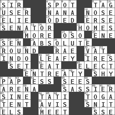 ACROSS 1. Title for a knight 4. Specific locale 8. Label 11. One who makes use of a thing 13. Grandmother 14. Sense of smell 15. Writer Wiesel 16. Wrote a lyric poem 17. Celtic language 18. Legislator 21. Residences 22. Greater amount 23. Bear (Spanish) 25. Compass dir. 26. Elected rep. 29. Utter; complete 32. Single shot of ammunition 34. Actress Charlotte 35. Large container 38. _ china 39. Like summer trees 41. Angers 43. Put into a specified state 44. Erode 45. Voters do this 46. Plea 50. Like a shrinking violet 51. Infant food 54. Double-curved letter 55. Observes 57. Sports stadium 59. More impudent 63. Trig term 64. Jacques of French films 67. Ancient Roman robe 68. Portable shelter 69. Deliberation 70. In a ____ (agitated or irritated) 71. Raised railways 72. Rendezvous 73. Compass dir. DOWN 1. Takes to court 2. Small island 3. It's straight from the horse's mouth 4. Sounds asleep 5. Writing tablet 6. Single 7. Small boy 8. Singer Mel 9. NE Netherlands city 10. Honkers 12. 480, 500 or 516 sheets of paper 14. Modern: prefix 19. Frog relative 20. Globe 21. Being at a high temperature 23. Norwegian king 24. Chop _ 26. _ Lanka 27. Immeasurably long periods of time 28. Naked 30. Declaim 31. Morally bad or wrong 33. Observe 36. Ancient Greek god of war 37. Georgia ____ (Atlanta school) 39. Allows 40. Hearing organs 42. Filthy place 45. Snake ____ (dice throw) 47. Teachers' org. 48. Help 49. Beverage made from leaves 51. Thick mixture 52. Satellite of Uranus 53. Actor Sean's family 56. Fast planes 58. Fish or hair follower 60. Charged atoms 61. Armor plate that protects the chest 62. Assign a rank or rating to 64. Scottish cap 65. "___ Maria" 66. Standoff