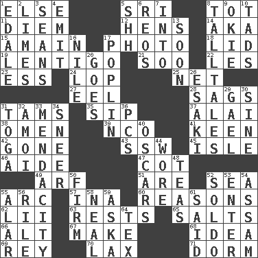ACROSS 1. Otherwise 5. _ Lanka 8. Small child 11. South Vietnam president (1954) 12. Coop moms 14. Alias (abbr.) 15. At full speed 17. Picture 18. Flaplike covering 19. Small, flat, pigmented spot on the skin 21. "Barney Miller" actor Jack 22. French article 23. Double-curved letter 24. Chop off 25. Fish or hair follower 27. Snakelike fish 28. Settles 31. Scottish caps 35. Small drink 37. Jai _ 38. Sign of things to come 39. Non-commissioned officer (abbr.) 41. Peachy ____! 42. Went 43. Compass dir. 45. Small island 46. Helper 47. Small bed 49. Sandy's bark 51. "We ___ not amused" (Victoria) 52. Ocean 55. Curve 57. _ tizzy (2 wds.) 60. Thinks logically 62. Cards in a Roman deck? 63. Musical pauses 65. Table seasonings 66. Keyboard modifier key 67. Create 68. It may be bright or harebrained 69. Marina Del _, California 70. Not strict 71. Dormintory (informal) DOWN 1. Peak District village in England 2. Citrus fruits 3. Actors Connery and Penn 4. Give off 5. Quiet! 6. Vintage cars 7. To the inside or interior of 8. Baron Munchausen's specialties 9. Migrant worker of the '30s 10. Bits 13. Within a short period 16. Mediterranean tributary 17. Cotton for raincoats, e.g. 20. Moves 26. 1973 Nobel Price Winner (Physics) Leo 29. Highlander 30. Trig term 31. Ancient Roman robe 32. Mine, in Marseilles 33. Ananias' fault 34. Scornful expression 36. Personal Computers (abbr.) 40. Motion picture awards 44. Had on 48. Afternoon social gatherings 50. Securely fixed in place 52. Twentieth part of a lira 53. Keyboard key 54. Indian state 55. Having or resembling wings 56. Cause heat under the collar 58. Anneal 59. "____ silly question..." 61. Alleged 64. John Ritter's dad