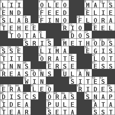 ACROSS 1. Cards in a Roman deck? 4. Butter sub 8. Floor coverings 12. Conclusion 13. Nourish 14. Writer Wiesel 15. Broad, flat, thick piece 17. Fine (Spanish) 18. Plants 19. Giggle 21. _ de Janeiro 23. Snakelike fish 24. Add up to 26. Two (Sp.) 28. Indian titles of respect 30. Modes 34. Compass dir. 37. Pale green bean 39. Armor plate that protects the chest 40. Teat (slang) 41. Speak pompously 43. Car dealer's back yard 44. Taverns 46. Celtic language 47. Curvy letter 48. Thinks logically 51. Uhlan (variant) 54. Acquire through effort 55. Settings 58. Period 61. Lion 63. Amusement-park features 65. Plates 67. Mouths or openings 71. Fastener 72. The content of cognition 73. Whine 74. "One Day ___ Time" 75. Separate forcefully 76. Stalk of a moss capsule 77. Fast jet (abbr.) DOWN 1. For fear that 2. An arm off of a larger body of water 3. Potato state 4. No longer planned or scheduled 5. Flowery wreath 6. Car or cant ending 7. Aroma 8. Cartoonist voice _ Blanc 9. _ vera 10. Hoop that covers a wheel 11. Lick closed 16. Wagers 18. Lowest support of a structure 20. Ewer handle 22. Binary compound 25. _ and Stitch 27. A female animal or person 29. Male parents of animals 30. Taiwanese island in East China Sea 31. Stare at amorously 32. "Vaya con ____" 33. Fast planes 34. Use a swizzle stick 35. Trig term 36. Inactive volcano in Sicily 38. Impair 42. Snakelike fish 45. Compass dir. 49. Petroleums 50. Compass dir. 52. Atmosphere 53. Nuclear Threat Initiatives 56. Ferber et al. 57. Theater features 58. Prepare for publication 59. Travel on or in a vehicle 60. Toward the sea 62. I made a mistake 64. Argument over a trivial matter 66. 4-wheeled motor vehicle 68. Sorrow 69. Keyboard modifier key 70. Ocean