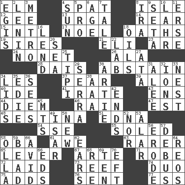 ACROSS 1. Shade tree 4. Argument over a trivial matter 8. Capri or Wight 12. Turn to the right 13. Capital and largest city of Mongolia 14. Located in or toward the back 15. International (abbr.) 17. Christmas carol 18. Expletives 19. Male parents of animals 21. Connecticut Ivy Leaguer 23. "We ___ not amused" (Victoria) 24. Music written for nine 26. According to 28. Raised platform 30. Choose not to consume 34. French article 37. Lightbulb-shaped fruit 39. Medicinal plant 40. Binary compound 41. Feeling or showing extreme anger 43. Followers of ems 44. South Vietnam president (1954) 46. Precipitation 47. Eastern Standard Time (abbr.) 48. French poetic form 51. Pulitzer Prize-winning author Ferber 54. Compass dir. 55. Having a sole or soles 58. Chief or king in Benin or Nigeria 61. Deep reverence 63. More valued for its uncommonness 65. Prying instrument 67. Johnson of "Laugh-In" 71. Loose flowing garment 72. Put down 73. Coral ridge 74. Superhero pair 75. Does sums 76. Posted 77. Double-curved letter DOWN 1. Armor plate that protects the chest 2. Soviet premier 1918-24 3. Paris' subway 4. Player for Phoenix 5. Adept person 6. Personal question 7. Story 8. Lyricist Gershwin 9. Bristle 10. Cowardly lion portrayer 11. Celtic language 16. Grant temporary use of 18. Lubricates 20. Ocean 22. Experiment locale 25. Native american tent (variation) 27. "One Day ___ Time" 29. Father Junipero _ 30. Nick name for Arthur 31. Toward shelter 32. Charged particles 33. Egg locale 34. Hats (slang) 35. Singer Brickell 36. Observes 38. American Automobile Association (abbr.) 42. Extremities 45. Mountains (abbr.) 49. Austrian river, tributary to the Danube 50. ___ Haven, CT 52. Or not 53. Having or resembling wings 56. Eat (away) 57. To get out of a bus 58. Water jar 59. Necklace unit 60. Enthusiastic 62. Hearing organs 64. Vintage cars 66. Begley and Asner 68. To riddle 69. "___ Little Indians" 70. Lizard (obsolete)