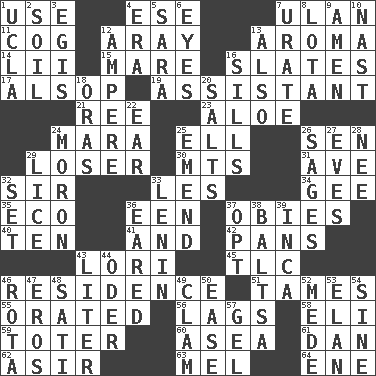 ACROSS 1. Purpose 4. Compass dir. 7. Uhlan (variant) 11. Gear tooth 12. Like ___ of sunshine 13. Odor 14. Cards in a Roman deck? 15. Female horse 16. Chalkboards 17. Columnist Joseph or Stewart 19. Helper 21. Portuguese money of account (variant) 23. Medicinal plant 24. Hindu Mythology: god of death 25. Pipe bend 26. Elected rep. 29. Failure 30. Mountains (abbr.) 31. "___ Maria" 32. Title for a knight 33. French article 34. Turn to the right 35. Environmental prefix 36. Car or cant ending 37. Off-Broadway awards 40. Nine, plus one 41. Also 42. Baking dishes 43. Australian parrot (variant) 45. Affectionate concern, for short 46. Home 51. Makes less strong or intense 55. Spoke pompously 56. Fails to keep up a pace 58. Connecticut Ivy Leaguer 59. Carrier 60. Toward the sea 61. One of the 12 tribes of Israel 62. SW Saudi Arabia district 63. Cartoonist voice _ Blanc 64. Compass dir. DOWN 1. Southern CA. univ. 2. Earth 3. Armor plate that protects the chest 4. Period 5. "Two Mules for Sister ____" 6. Snake ____ (dice throw) 7. A salt of uric acid 8. Globular water bottle used in Asia 9. So be it 10. Political cartoonist Thomas 12. Electrical Unit 13. In addition 16. Beverly of Met fame 18. Mouths or openings 20. Table seasonings 22. Hearing organ 24. Person of subnormal intelligence 25. Make improvements or corrections to 26. Gurus 27. Nights before holidays 28. Born 29. Louse (plural) 32. Put into a specified state 33. Soviet premier 1918-24 36. Having ears or earlike features 37. Elect 38. Greek mezzo-soprano Agnes 39. South American Indian 43. 61 cubic inches 44. Baltic tributary 46. Round or rotation of duties 47. Greek god of love 48. Suttee (variant) 49. Dollar (slang) 50. Comfort 52. Ancient Persian 53. Enthusiasm 54. Trig term 57. Set