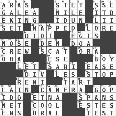 ACROSS 1. Caspian sea tributary 5. Proofreading order 9. Compass dir. 12. An organ shaped like a helmet 14. The longest river in the world 15. It would 16. Supplementing with great effort 17. Goddess of spring and wife of Bragi 18. Cards in a Roman deck? 19. Arrange properly for use 20. Slept 23. Old wives' tales, e.g. 24. "You Light Up My Life" star Conn 25. Armor plate that protects the chest 27. Olfactory organ 30. Lair 32. ___ good deed 33. Group working together 34. Leave at once 36. Mouth or opening 38. Chief or king in Benin or Nigeria 39. Compass dir. 40. Male child 43. Allow 46. Indian skirt 48. Relaxation 49. HTML Container Element 51. French article 52. Obstruct or block passage 53. Painter Guido (1575-1642) 54. Small pie 56. (Had) reclined 58. Device for capturing images 61. Grand Old Party 64. Wedding promise 65. Inactive volcano in Sicily 66. Connects, as a bridge 68. Fish or hair follower 69. Calm and collected 70. _____ Park, CO 71. Followers of ems 72. Relating to the mouth 73. Trial DOWN 1. Eras 2. Libertine 3. Came down and settled, as after flight 4. Elected rep. 5. Clip 6. Event that recurs at intervals 7. Dodged 8. "___ Little Indians" 9. Grain storage towers 10. Use a spoon 11. Singer Brickell 13. Hindu god of fire 21. Does sums 22. Components 23. One who doesn't tell the truth 24. Morning condensation 26. Thick or sticky substance 27. Non-commissioned officer (abbr.) 28. Globe 29. Lick closed 31. Rhinal 35. Cigar-shaped 37. Blind as ____ 41. Bear (Spanish) 42. Slangy assent 44. Locale of original sin 45. Shallow baking pan 47. Austrian river, tributary to the Danube 48. Eastern Standard Time (abbr.) 50. Winning man's name 53. Debaucheries 55. To erase 56. Actor's bit 57. An important port of Yemen 59. Small Philippine buffalo 60. Promenade 61. Yard entry 62. Singles 63. Inconspicuous attention getter 65. Environmental prefix 67. Pacific Standard Time (abbr.)
