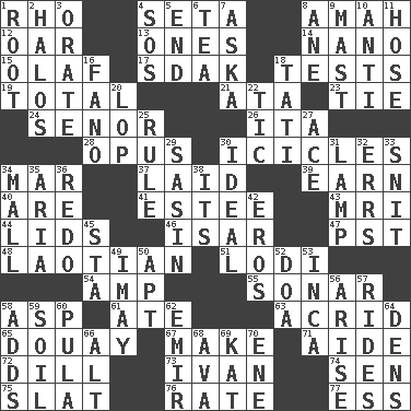 ACROSS 1. 17th letter of the Greek alphabet 4. Bristle 8. Wet nurse 12. Rowing implement 13. Washington bills 14. Billionth: prefix 15. Norwegian king 17. Neighbor of Neb. 18. Trials 19. "_____ Recall" 21. _ moment's notice (2 wds.) 23. Neckwear 24. Sir (Sp.) 26. Call ___ day 28. Musical composition 30. Winter's stalactites 34. Spoil 37. Put down 39. Merit 40. "We ___ not amused" (Victoria) 41. First name in cosmetics 43. Medical imaging device (abbr.) 44. Flaplike coverings 46. Austrian river, tributary to the Danube 47. Pacific Standard Time (abbr.) 48. Of or relating to Laos or its people 51. Farming town in central California 54. Electrical Unit 55. Underwater navigation system 58. Viper 61. Had dinner 63. Sour-tasting 65. A city in N France, SE of Calais 67. Cause to be 71. Helper 72. Deli pickle 73. "Terrible" tsar 74. Elected rep. 75. Narrow board 76. Assign a rank or rating to 77. Double-curved letter DOWN 1. Carrot, for example 2. Radiant circles of light 3. Speak pompously 4. Distress signal 5. Conclusion 6. Afternoon social gathering 7. "____ silly question..." 8. One (Scot) 9. Vertical spar for supporting sails 10. Opposed to 11. Stockings 16. Papal veil 18. Jacques of French films 20. Trim (branches) 22. Nervous spasm 25. Court order 27. Adept person 29. Indian antelope 30. Standard of perfection 31. Desk light 32. Blunders 33. In a ____ (agitated or irritated) 34. Shopping center 35. Operatic vocal solo 36. Make new 38. ___ a Wonderful Life 42. Greek god of love 45. R.R. building 49. "If ____ say so..." 50. Fitting 52. ___ good deed 53. South American Indian 56. Get up 57. Amusement-park features 58. Does sums 59. Land 60. Monetary unit of Botswana 62. Arab leader 64. Habitations of wild animals 66. The first octave above the treble staff 68. Actress Gardner 69. Krazy ___ of comics 70. Compass dir.