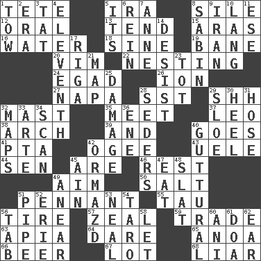 ACROSS 1. False hair 5. Retirement account (abbr.) 8. Filth; sediment 12. Taken by mouth 13. Be inclined (to) 15. Caspian sea tributary 16. Wetness 18. Trig term 19. Object of repulsion 20. Zeal 22. Snuggling 24. Mild oath 26. Electrically charged atom 27. California wine valley 28. Fast jet (abbr.) 29. Quiet! 32. Vertical spar for supporting sails 35. Confront 37. Lion 38. Bowlike part 39. Plus 40. Moves 41. Parent Teacher Assoc. 42. Double curve, resembling the letter S 43. Ubangi River tributary 44. Elected rep. 45. "We ___ not amused" (Victoria) 46. Remainder 49. Direct toward a target or goal 50. Table seasoning 51. Pre-World Series prize 55. The 19th letter of the Greek alphabet 56. Hoop that covers a wheel 57. Ardor 59. Barter 63. Capital of Western Samoa 64. Have the gumption 65. Small Philippine buffalo 66. Fermented drink made from hops 67. Car dealer's back yard 68. One who doesn't tell the truth DOWN 1. Pull behind 2. Period 3. Make lace 4. Veterans Day date 5. ___ a Wonderful Life 6. It's straight from the horse's mouth 7. Singer Murray 8. Unit of acoustic absorption 9. SW Asia republic 10. Long (Scottish) 11. Compass dir. 14. Cease 17. Port city in Latvia 21. Atlas unit 23. Small child 25. Break 28. Spring feasts 29. A type of plum 30. Person who is morally reprehensible 31. Stockings 32. Atlas contents 33. Johnson of "Laugh-In" 34. Examine hastily 36. Compass dir. 40. From the throat 42. Chief deity of Zoroastrianism 45. The 18th letter of the Arabic alphabet 47. Ingest 48. Narrow board 49. Approach 51. Corncob 52. 4th largest of the Great Lakes 53. Be tempered by heat 54. Pacific island yam 56. Bar bill 58. Allow 60. Cuckoo 61. ___ good deed 62. Ewer handle