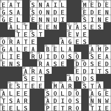 ACROSS 1. Consume 4. Slow-paced one 9. Ancient Persian 13. Girls' org. (abbr.) 14. Message 15. Genesis locale 16. Set 17. World-weariness 18. Trig term 19. Keyboard modifier key 21. Car or cant ending 22. Flower holders 24. Trial 26. Night before a holiday 27. Declaim 29. Matures 30. An organ shaped like a helmet 31. Actor Lugosi 33. Electrical Unit 36. Falsehood 37. Boisterous (Brazilian Portuguese) 40. Ocean 41. Followers of ems 42. To erase 43. Administered medicine 45. Ancient river in northeast Turkey 47. Proofreads 48. Arrange properly for use 49. Does sums 50. First name in cosmetics 52. Make imperfect 54. R.R. building 56. Toward shelter 57. Twentieth part of a lira 59. Personal question 61. Russian ruler of old 62. Goodbye (Sp.) 63. Compass dir. 64. Snakelike fish 65. Stone: prefix 66. Standoff DOWN 1. Oval reproductive body of a fowl 2. At sea 3. Baron Munchausen's specialties 4. Compass dir. 5. Music written for nine 6. Queen of England 1702-14 7. Goddess of spring and wife of Bragi 8. Luau accessory 9. Makes clutter 10. Singer Brickell 11. Habitations of wild animals 12. Compass dir. 20. Wig 22. Viva Las _ 23. "___ Maria" 25. Burn superficially 27. Stare 28. Precipitation 29. Medicinal plant 31. Prejudice 32. Begley and Asner 33. Helper 34. Confront 35. Groovy apts. 38. A salt of uric acid 39. Wrote a lyric poem 44. Probability 45. Michaelmas daisies 46. To separate or throw off 49. Zeal 50. Otherwise 51. Lick closed 52. Method 53. Came down and settled, as after flight 55. Hindu god of fire 56. Had dinner 57. Plant excrement 58. Bear (Spanish) 60. She-sheep