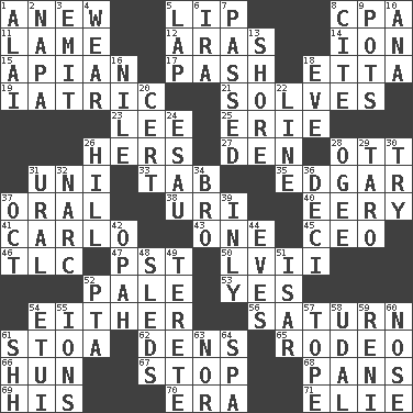 ACROSS 1. Afresh 5. Mouth edge 8. Tax preparer (abbr.) 11. Unable to walk 12. Caspian sea tributary 14. Electrically charged atom 15. Bee-related 17. Romantic infatuation 18. Singer James 19. Of or pertaining to medicine 21. Finds the solution 23. Area sheltered from the wind 25. One of the Great Lakes 26. Possessive pronoun 27. Lair 28. Baseball player Mel 31. Corn or form start 33. Keyboard key 35. _ Allan Poe 37. Relating to the mouth 38. RI univ. 40. Suggestive of the supernatural 41. Monte _, Las Vegas Hotel/Casino 43. Single 45. Corporate head (abbr.) 46. Affectionate concern, for short 47. Pacific Standard Time (abbr.) 50. 57 in ancient Rome 52. Diluted with white 53. It is so 54. One or the other 56. Titan orbits this 61. Portico 62. Lairs 65. Cowboy competition 66. Attila the _ 67. Close up, plug up 68. Zero-star reviews 69. Part of HMS, perhaps 70. Epoch 71. Writer Wiesel DOWN 1. Mountain range southwest of Kyrgyzstan 2. California wine valley 3. Give off 4. Erode 5. Infant locale 6. Lyricist Gershwin 7. Went by 8. Quote 9. Plant holders 10. Santa ___, CA 13. Dinah or Pauly 16. The longest river in the world 18. First lady 20. Certainty 22. Actor's bit 24. He sold his birthright 26. Land elevation 28. Double curve, resembling the letter S 29. Pacific island yam 30. Attempt 31. Mountain range 32. Drug cop 34. Sis' sibling 36. Tenth: prefix 37. Sep. follower 39. In an inward manner 42. Brightly colored fish 44. Nights before holidays 48. Bobsleighs 49. Cigar-shaped 51. Austrian river, tributary to the Danube 52. Parent Teacher Assoc. 54. Needle holder 55. Charged atoms 57. Drink excessively 58. Hereditary estate 59. Painter Guido (1575-1642) 60. Characteristic smell of wine 61. Quiet! 63. Or not 64. Health resort
