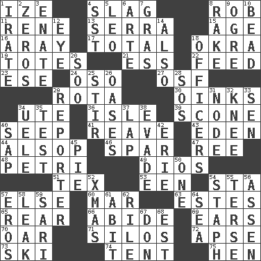 ACROSS 1. Ending with capital 4. Volcanic refuse 8. Director Reiner 11. French philosopher Descartes 13. Spanish missionary in California 15. Mature 16. Like ___ of sunshine 17. "_____ Recall" 18. Gumbo ingredient 19. Lugs 21. Curvy letter 22. Nourish 23. Compass dir. 24. Bear (Spanish) 27. Order of Saint Francis (abbr.) 29. Roll call or roster of names 30. Pig sounds 34. Shoshoni 36. Capri or Wight 39. Biscuitlike quick bread 40. Ooze 41. Break or tear apart 43. Locale of original sin 44. Columnist Joseph or Stewart 46. Coast Guard woman 47. To sift 48. _ dish (used to culture cells) 49. "Vaya con ____" 51. John Ritter's dad 53. Car or cant ending 54. R.R. building 57. Otherwise 60. Spoil 63. _____ Park, CO 65. Located in or toward the back 66. Tolerate 69. Hearing organs 70. Boat paddle 71. Grain storage towers 72. Domed church section 73. What Jean-Claude Killy likes to do 74. Portable shelter 75. Layer DOWN 1. Feeling or showing extreme anger 2. Nothings 3. Related on the mother's side 4. Fast jet (abbr.) 5. Lion 6. Johnson of "Laugh-In" 7. Pate de foie ____ 8. Immoral or dissolute person 9. Legendary monster 10. Necklace unit 12. Sight organ 14. In addition 18. Persons of authority 20. "Barney Miller" actor Jack 25. Move through with a circular motion 26. Fertile tracts in a desert 28. Distress signal 29. Newsperson 31. Connecting point 32. Leg joint 33. Elected rep. 34. Ubangi River tributary 35. Trial 37. Pet locale 38. Elude 40. Plant excrement 42. 4th largest of the Great Lakes 45. Sliced dessert 50. Single 52. Dec. holiday 54. Staphylococcus 55. Laconic 56. NE Netherlands city 57. Greek god of love 58. Path through which fluid escapes 59. Indian skirt 61. "This won't hurt ____!" 62. Cause heat under the collar 64. Ocean 67. Spanish title 68. Eastern Standard Time (abbr.)