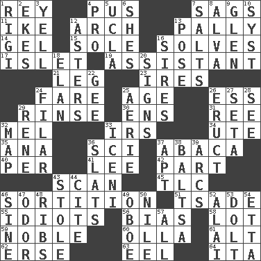 ACROSS 1. Marina Del _, California 4. Purulenc 7. Sinks 11. Eisenhower's nickname 12. Bowlike part 13. Chummy 14. Set 15. Flatfish 16. Finds the solution 17. Small island 19. Aide 21. Part of a journey 23. Angers 24. Conductor's collection 25. Ripen 26. Curvy letter 29. Wash lightly 30. Followers of ems 31. To separate or throw off 32. Cartoonist voice _ Blanc 33. Big collection agency 34. Shoshoni 35. Santa ___, CA 36. _-fi 37. Phillipine bananalike plant 40. For each 41. Area sheltered from the wind 42. Role in a play 43. Skim 45. Affectionate concern, for short 46. Casting lots 51. Sadhe (variant) 55. Foolish or stupid persons 56. Prejudice 58. Car dealer's back yard 59. Impressive in appearance 60. Spanish pot 61. Keyboard modifier key 62. Celtic language 63. Snakelike fish 64. Call ___ day DOWN 1. Swiss mountan, "Queen of the Mountains" 2. Makes supply last 3. Shout 4. Adept person 5. Southern CA. univ. 6. "______ My Girl" (Turtles hit) 7. Table seasonings 8. Inventor's middle name 9. Small, secluded valley 10. System (abbr.) 12. Michaelmas daisies 13. Airs 16. Begets 18. Flair 20. Public displays of written messages 22. Turn to the right 24. Of or pertaining to a thread or threads 25. Nest on high 26. Spew [out] 27. Stalk of a moss capsule 28. Observe 29. French philosopher Descartes 32. Atlas unit 33. Ancient Celtic tribe of eastern Britain 36. Narrow boards 37. Fitting 38. Greek mezzo-soprano Agnes 39. Curves 43. Took without asking 44. Quote 46. Trig term 47. Aroma 48. Teases 49. Mitch Miller's instrument 50. The longest river in the world 52. Jai _ 53. Dunce 54. Singer James 57. Everything