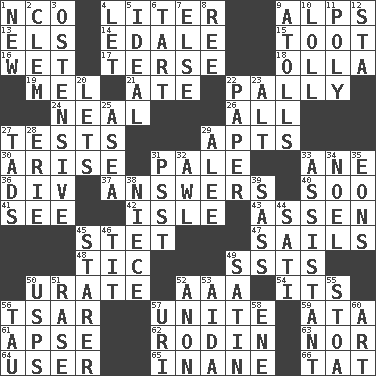 ACROSS 1. Non-commissioned officer (abbr.) 4. 61 cubic inches 9. High mountains 13. Raised railways 14. Peak District village in England 15. A blast of a horn 16. Soggy 17. Laconic 18. Water jar 19. Cartoonist voice _ Blanc 21. Had dinner 22. Chummy 24. Actress Patricia 26. Everything 27. Trials 29. Tenement units (abbr.) 30. Originate 31. Diluted with white 33. One (Scot) 36. HTML Container Element 37. Statements in reply to questions 40. "Barney Miller" actor Jack 41. Observe 42. Capri or Wight 43. NE Netherlands city 45. Proofreading order 47. Moves on water 48. Nervous spasm 49. Fast planes 50. A salt of uric acid 52. American Automobile Association (abbr.) 54. It is 56. Russian ruler of old 57. Join together 59. "One Day ___ Time" 61. Domed church section 62. "The Thinker" sculptor 63. Or not 64. One who uses or employs something 65. Lacking in sense or substance 66. Make lace DOWN 1. ___ Haven, CT 2. Clement's nick name 3. Clearly or manifestly demonstrative 4. Allow 5. Standard of perfection 6. Small pie 7. Otherwise 8. Portuguese money of account (variant) 9. Ringlike coral islands and reefs 10. Hang loosely or laxly 11. Many (prefix) 12. R.R. building 20. Allows 22. Some stationery 23. The first octave above the treble staff 25. At sea 27. Bits 28. One of the Great Lakes 29. Toward shelter 31. Inconspicuous attention getter 32. Leather borer 33. Aide 34. Christmas carol 35. Immeasurably long periods of time 38. Sibling's daughter 39. Backtalk 44. Suttee (variant) 45. A viewer who gazes fixedly 46. Teat (slang) 49. Smooth fabric 50. United States Postal Service (abbr.) 51. Raze (variant) 52. Soon (poet.) 53. Opera by Verdi 55. Portico 56. The 19th letter of the Greek alphabet 57. RI univ. 58. Compass dir. 60. Tate display