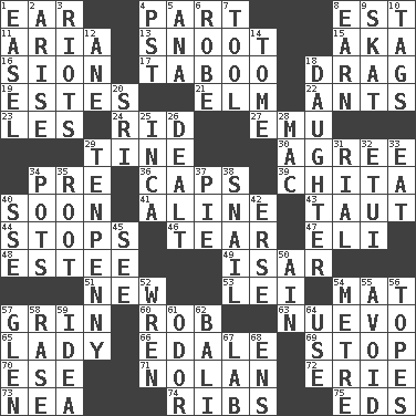 ACROSS 1. Hearing organ 4. Piece 8. Eastern Standard Time (abbr.) 11. Operatic vocal solo 13. Snob 15. Alias (abbr.) 16. The Jewish people; Israel 17. Off limits 18. To draw with force 19. _____ Park, CO 21. Shade tree 22. Pismires 23. French article 24. To free from 27. Australian flightless bird 29. Prong on a fork 30. Match 34. Before (prefix) 36. Smile enhancers 39. Riviera of "Kiss of the Spider Woman" 40. Within a short period 41. Place in a line 43. Tense 44. Discontinues 46. Rend 47. Connecticut Ivy Leaguer 48. First name in cosmetics 49. Austrian river, tributary to the Danube 51. ___ Haven, CT 53. Luau accessory 54. Floor protector 57. Amused look 60. Director Reiner 63. New (sp.) 65. Kenny Rogers chart-topper in '80 66. Peak District village in England 69. Discontinue 70. Compass dir. 71. Pitcher Ryan 72. 4th largest of the Great Lakes 73. Teachers' org. 74. Chest bones 75. Begley and Asner DOWN 1. Artist's stand 2. Get up 3. Debaucheries 4. Pacific Standard Time (abbr.) 5. Santa ___, CA 6. Loose flowing garment 7. Instrument 8. Merit 9. Three-handed card game 10. Labels 12. A saturated hydrocarbon 14. Heavy book 18. Female child 20. Indian title of respect (Mr.) 25. South American Indian 26. Started a card game 28. Apple computer (short form) 29. 3-inch nail 31. Monetary unit of Yemen 32. Needle holder 33. Consume 34. Cooking vessels 35. Carrot, for example 37. Sliced dessert 38. Slow-paced one 40. Compass dir. 42. Celtic language 45. Perceive with the eye 50. The 18th letter of the Arabic alphabet 52. Songbird 54. Distance measurement (Brit.) 55. Prevent the occurrence of 56. Drinks excessively 57. Small, secluded valley 58. To erase 59. The content of cognition 61. Aroma 62. Indonesian resort city 64. Purpose 67. Experiment locale 68. Followers of ems
