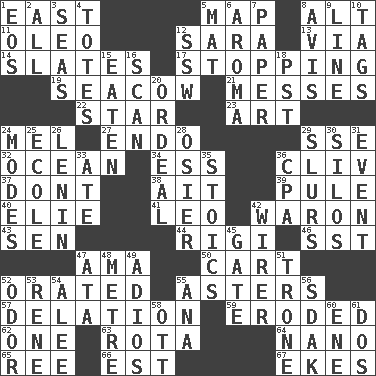 ACROSS 1. Compass direction 5. Atlas unit 8. Keyboard modifier key 11. Butter sub 12. "Two Mules for Sister ____" 13. By way of 14. Chalkboards 17. Ceasing 19. Manatee 21. Makes clutter 22. Play the lead 23. Nonscientific branch of learning 24. Cartoonist voice _ Blanc 27. Inside; within (prefix) 29. Compass dir. 32. Sea 34. Curvy letter 36. 154 in Roman numerals 37. Do not 38. Small island 39. Whine 40. Writer Wiesel 41. Lion 42. Make _____ (do battle with) 43. Elected rep. 44. Swiss mountan, "Queen of the Mountains" 46. Fast jet (abbr.) 47. Housemaid (var.) 50. Heavy open wagon 52. Declaimed 55. Michaelmas daisies 57. Accusation by an informer 59. Eaten away 62. Single 63. Round or rotation of duties 64. Billionth: prefix 65. To sift 66. Eastern Standard Time (abbr.) 67. Makes supply last DOWN 1. Greek goddess of the dawn 2. Everything 3. Oceans 4. Hauls 5. Floor covering 6. Scent 7. Some stationery 8. Opinion 9. Actor's bit 10. Labels 12. Compass dir. 15. Ingested 16. Examine minutely or intensely 18. Pacific Standard Time (abbr.) 20. Severe or trying experience 24. Methods 25. Learning spot: Fr. 26. Soviet premier 1918-24 28. Flexible twig of a willow tree 29. Runs notes together 30. Grain storage towers 31. Incident 33. Had dinner 35. Unemotional ones 36. Tax preparer (abbr.) 42. One who wires 45. Yard entry 47. _ moment's notice (2 wds.) 48. Distance measurement (Brit.) 49. Goodbye (Sp.) 51. Heavy duty weighing machine 52. Scent 53. French philosopher Descartes 54. Toward shelter 55. Santa ___, CA 56. Neighbor of Neb. 58. Baseball player Mel 60. Compass dir. 61. Two (Sp.)