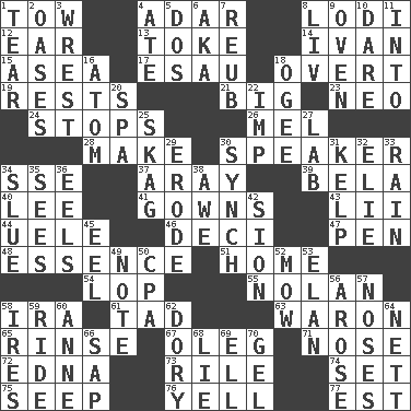 ACROSS 1. Pull behind 4. The sixth month of the Jewish calendar 8. Farming town in central California 12. Ewer handle 13. Puff or smoke 14. "Terrible" tsar 15. Toward the sea 17. He sold his birthright 18. Unconcealed 19. Musical pauses 21. Large 23. Modern: prefix 24. Closes up, plugs up 26. Cartoonist voice _ Blanc 28. Cause to be 30. Orator 34. Compass dir. 37. Like ___ of sunshine 39. Actor Lugosi 40. Area sheltered from the wind 41. Brides' dresses 43. Cards in a Roman deck? 44. Ubangi River tributary 46. Tenth: prefix 47. Fenced enclosure 48. Center 51. Dwelling 54. Trim (branches) 55. Pitcher Ryan 58. Lyricist Gershwin 61. Small amount or degree 63. Make _____ (do battle with) 65. Remove soap 67. Cassini of fashion 71. Sense of smell 72. Pulitzer Prize-winning author Ferber 73. Cause heat under the collar 74. Arrange properly for use 75. Ooze 76. Shout 77. Eastern Standard Time (abbr.) DOWN 1. Separate forcefully 2. Fertile tracts in a desert 3. Obtain by seizing forcibly or violently 4. Had dinner 5. Two (Sp.) 6. Alias (abbr.) 7. Reuben's nickname 8. 54 in ancient Rome 9. Baking chamber 10. Have the gumption 11. To the inside or interior of 16. Smallest unit of an element 18. Double curve, resembling the letter S 20. Health resort 22. Naughty child 25. Heroin 27. Experiment locale 29. Eat (away) 30. Synchronize (abbr.) 31. Seaweed 32. Writer Wiesel 33. Water falling in drops from the sky 34. Change direction abruptly 35. Observes 36. Snakelike fish 38. Deep reverence 42. The Jewish people; Israel 45. Snakelike fish 49. Brief written record 50. Accounting whiz (abbr.) 52. Cut the grass 53. Enthusiasm 56. Came up 57. Olfactory organs 58. Angers 59. Travel on an animal 60. Queen of England 1702-14 62. Rowboat 64. Remaining after all deductions 66. Plant excrement 68. Falsehood 69. Pipe bend 70. Set