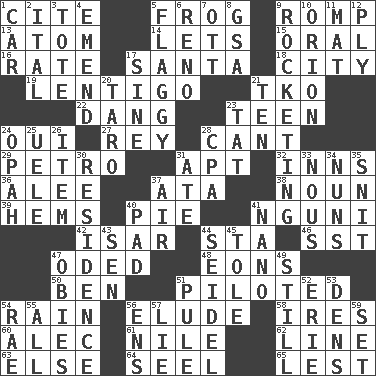 ACROSS 1. Quote 5. Tree-dwelling hopper 9. Play 13. Smallest unit of an element 14. Allows 15. Relating to the mouth 16. Pace 17. Before Barbara or Clara 18. Municipality 19. Small, flat, pigmented spot on the skin 21. Ring climax 22. Mild oath, euphamism for damn 23. Adolescent 24. Fr. "Yes" 27. Marina Del _, California 28. Patter 29. Stone: prefix 31. Fitting 32. Taverns 36. Toward shelter 37. "One Day ___ Time" 38. Part of speech 39. Folds over and sews together 40. Sliced dessert 41. Group of southern Bantu languages 42. Austrian river, tributary to the Danube 44. R.R. building 46. Fast jet (abbr.) 47. Wrote a lyric poem 48. Immeasurably long periods of time 50. Benjamin's nick name 51. Manned the helm 54. Precipitation 56. Dodge 58. Angers 60. Actor Baldwin 61. "Death on the ____" 62. Actor's bit 63. Otherwise 64. Stitch closed the eyes of (a falcon) 65. For fear that DOWN 1. Automobile 2. Slanted text style (abbr.) 3. Lug 4. Make improvements or corrections to 5. Tasteless 6. Former U.S. Attorney General Janet 7. Baseball player Mel 8. Girls' org. (abbr.) 9. Shooting up abruptly 10. Greek mythologigal hunter 11. Floor covering 12. Strand of rope, yarn or thread 17. Trig term 20. Pacific island yam 21. Nine, plus one 23. Make lace 24. Brightly colored fish 25. Ubangi River tributary 26. A distinct part 28. Accounting whiz (abbr.) 30. Dwelling 31. Had dinner 33. Common sense 34. Religious women 35. In a ____ (agitated or irritated) 37. Atmosphere 40. Groovy apt. 41. Billionth: prefix 43. Elected rep. 44. A glass for beer 45. Lacquered or enameled metalware 47. Off-Broadway awards 49. Not moving 51. Whine 52. 4th largest of the Great Lakes 53. Hiding places for outlaws 54. Actress Charlotte 55. Everything 56. Followers of ems 57. Untruth 59. Put into a specified state