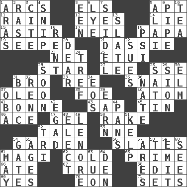 ACROSS 1. Arches 5. Raised railways 8. Fitting 11. Water falling in drops from the sky 12. Snake ____ (dice throw) 14. Whopper 15. Moving or stirring 17. Famous astronaut Armstrong 18. Dad 19. Oozed 21. Hyrax 23. Fish or hair follower 25. Needle case 26. Play the lead 27. Area sheltered from the wind 28. Compass dir. 31. Sis' sibling 33. Portuguese money of account (variant) 35. Slow-paced one 37. Butter sub 38. Enemy 40. Tiny particle 41. Child's nurse 43. Plant excrement 45. Shallow baking pan 46. Adept person 47. Set 50. Immoral or dissolute person 52. Lie 53. Compass dir. 54. Place where plants grow 56. Chalkboards 61. Wise men 62. Lacking warmth 65. A-one 66. Had dinner 67. Loyal 68. Singer Brickell 69. It is so 70. Age 71. Arranges properly for use DOWN 1. Caspian sea tributary 2. Raze (variant) 3. Quote 4. Clip 5. Car or cant ending 6. Potassium hydroxide 7. Beer mug 8. Jai ____ 9. Corncob 10. Afternoon social gathering 13. Chalkboard 16. Monthly bill 18. Air pressure measure (abbr.) 20. Letter starter 22. Takes to court 24. Unclean, religiously 26. Within a short period 28. Suttee (variant) 29. The Jewish people; Israel 30. Shade tree 31. Alliance 32. French philosopher Descartes 34. Greek goddess of the dawn 36. Nathan's nickname 37. Chief or king in Benin or Nigeria 39. Merit 42. Mild oath 44. Zero-star reviews 48. Opt 49. Poe poem 51. Seaweed 52. Three (prefix) 54. Yard entry 55. Grows older 57. Ancient Greek god of war 58. Event that recurs at intervals 59. Give off 60. Perceives with the eye 61. Can I? 63. Nilotic language 64. Lair
