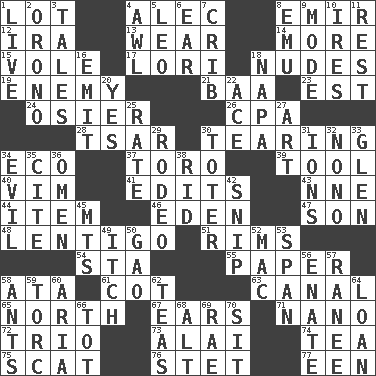 ACROSS 1. Car dealer's back yard 4. Actor Baldwin 8. Independent ruler or chieftain 12. Retirement account (abbr.) 13. Erode 14. Greater amount 15. Grand slam 17. Australian parrot (variant) 18. Unadorned figures 19. Foe 21. Sound made by sheep 23. Eastern Standard Time (abbr.) 24. Flexible twig of a willow tree 26. Numbers guy (abbr.) 28. Russian ruler of old 30. Rending 34. Environmental prefix 37. "Corrida" creature 39. Instrument 40. Zeal 41. Proofreads 43. Compass dir. 44. A distinct part 46. Paradise 47. Boy, to dad 48. Small, flat, pigmented spot on the skin 51. Basketball hoops 54. R.R. building 55. Some stationery 58. "One Day ___ Time" 61. Small bed 63. Lessep's creation 65. 0 degrees 67. Hearing organs 71. Billionth: prefix 72. Musical group of three 73. Mountain range southwest of Kyrgyzstan 74. Afternoon social gathering 75. Leave at once 76. Proofreading order 77. Car or cant ending DOWN 1. Not recorded 2. U. of Maine site 3. Falsehoods 4. Leather borer 5. Lion 6. Hearing organ 7. Baby bed with high sides 8. Australian flightless bird 9. Method 10. Angers 11. State of inaction 16. Give off 18. California wine valley 20. Consenting reply 22. Adept person 25. Pace 27. Nonscientific branch of learning 29. Cowboy competition 30. Carrier 31. Charged atoms 32. Words to Nanette 33. Small, secluded valley 34. Tending to cause great harm 35. Quote 36. Sign of something about to happen 38. To free from 42. Sever or remove by pinching or nipping 45. Mountains (abbr.) 49. Hankering 50. E Mali city 52. Apple computer (short form) 53. Connect, as a bridge 56. Related on the mother's side 57. Indian princess (variant) 58. Pismires 59. Torque (variant) 60. Operatic vocal solo 62. Beverages made from leaves 64. Grant temporary use of 66. Small child 68. The first octave above the treble staff 69. Actress Charlotte 70. Be seated