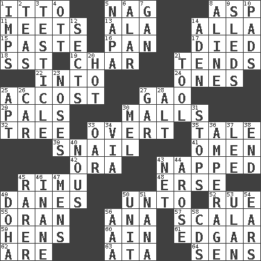 ACROSS 1. "Tell ____ the Marines!" 5. Tired old horse 8. Viper 11. Confronts 13. In the manner of 14. Silent film actress Nazimova 15. Thick mixture 16. Baking dish 17. Passed on 18. Fast jet (abbr.) 19. Burn to charcoal 21. Is inclined (to) 22. To the inside or interior of 24. Washington bills 25. Buttonhole 27. E Mali city 29. Friends 30. Shopping centers 32. Family _ (genealogy) 33. Unconcealed 35. Lie 39. Slow-paced one 41. Sign of things to come 42. Mouth or opening 43. Slept 45. Tall New Zealand timber tree 48. Celtic language 49. Natives or inhabitants of Denmark 50. To (old English) 52. Regret 55. NW Algerian seaport 56. Santa ___, CA 57. Any of the three canals of the cochlea 59. Coop moms 60. The 18th letter of the Arabic alphabet 61. _ Allan Poe 62. "We ___ not amused" (Victoria) 63. "One Day ___ Time" 64. Elected reps. DOWN 1. Naughty children 2. Beverages made from leaves 3. A testis 4. Baseball player Mel 5. California wine valley 6. Having or resembling wings 7. Separate the seeds from cotton 8. Place in a line 9. Bobsleighs 10. Groovy apts. 12. Religious groups 14. An important port of Yemen 20. Being at a high temperature 21. Implement 23. Olfactory organs 25. Fitting 26. Automobile 27. Slender fish 28. The first octave above the treble staff 30. Cartoonist voice _ Blanc 31. Halts 33. Boat paddle 34. By way of 36. Electrical Measurement 37. Area sheltered from the wind 38. Conclusion 40. Horse sense 43. Fish or hair follower 44. Came up 45. More uncommon 46. Empty; void 47. Not women's 49. Capital of the state of Qatar 50. A single undivided whole 51. Grandmother 53. Uhlan (variant) 54. Hearing organs 56. Auto club (abbr.) 58. Music discs