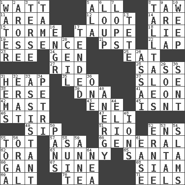 ACROSS 1. Electrical Unit 5. Everything 8. The 23rd letter of the Hebrew alphabet 11. Length times width 12. Spoils 14. "We ___ not amused" (Victoria) 15. Singer Mel 17. Grayish beige 18. Untruth 19. Substance 21. Pacific Standard Time (abbr.) 22. Infant locale 23. To sift 24. Commissioned military rank (abbr.) 25. Consume 27. To free from 28. Backtalk 31. Pile 35. Lion 37. A type of plum 38. Celtic language 39. Heredity factor (abbr.) 41. A really long time 42. Vertical spar for supporting sails 43. Compass dir. 45. Is not 46. Move through with a circular motion 47. Biblical high priest 49. Small drink 51. River (Sp.) 52. Followers of ems 55. Small child 57. White ___ sheet 60. Commissioned military rank 62. Mouth or opening 63. Pet term 65. Before Barbara or Clara 66. Separate the seeds from cotton 67. Trig term 68. Thailand, formerly 69. Keyboard modifier key 70. Afternoon social gathering 71. Snakelike fish DOWN 1. Wetness 2. Came up 3. Laconic 4. Docile 5. According to 6. Central Nebraska county 7. Chops off 8. Baron Munchausen's specialties 9. Operatic vocal solo 10. Shed a tear 13. Wig 16. Engineer (abbr.) 17. Looked after 20. To provide with a ceiling 26. Slender Brazilian palm 29. Within a short period 30. Posted 31. Is hesitant and indecisive 32. Part of Q.E.F. 33. Helper 34. _ dish (used to culture cells) 36. Single 40. Disorder of the immune system 44. Writer Wiesel 48. Charged particles 50. Baking dishes 52. Bert's buddy 53. Relating to or accompanying birth 54. Shuts with force 55. Ancient Roman robe 56. Spoken 58. Costume for a special activity 59. Queen of England 1702-14 61. Comfort 64. Teachers' org.