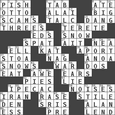 ACROSS 1. Expression of disdain 5. Keyboard key 8. Had dinner 11. "Beetle Bailey" pooch 12. Jai _ 14. Large 15. Fraudulent business schemes 17. Baby powder 18. Mild oath, euphamism for damn 19. Threesomes 21. Cigar-shaped 23. Begley and Asner 25. Frozen precipitation 26. Petty quarrel 27. Small island 28. Teachers' org. 31. Pipe bend 33. Krazy ___ of comics 35. To the left, to Queeg 37. Portico 38. Tired old horse 40. Small Philippine buffalo 41. Overwhelms 43. Armed conflict 45. Two (Sp.) 46. Erode 47. Deep reverence 50. Hearing organs 52. Sliced desserts 53. Untruth 54. Medicinal drug used to evoke vomiting 56. Annoying sounds 61. SW Asia republic 62. To erase 65. Vertical member of a panel or frame 66. Lair 67. Indian titles of respect 68. Actor Alda or Thicke 69. Curvy letter 70. Before (prefix) 71. Grant temporary use of DOWN 1. Mail 2. Hankering 3. Play the lead 4. Residence 5. Make lace 6. Insect wing 7. Greek mezzo-soprano Agnes 8. Blind as ____ 9. Prong on a fork 10. Ovum 13. Ancient Celtic tribe of eastern Britain 16. Ooze 18. Morning condensation 20. Neighbor of Neb. 22. Roll call or roster of names 24. Comedian Laurel of Laurel & Hardy 26. Cole _ (cabbage dish) 28. Words to Nanette 29. Greek god of love 30. _ moment's notice (2 wds.) 31. Inactive volcano in Sicily 32. Spoils 34. The 23rd letter of the Hebrew alphabet 36. Groovy apts. 37. Compass dir. 39. Highlander 42. Ketch in the Levant 44. Water falling in drops from the sky 48. Puts on (as clothing) 49. Fortification 51. Vintage cars 52. Writing instrument 54. Angers 55. Baking dishes 57. Slanted text style (abbr.) 58. Filth; sediment 59. Style 60. Transmit 61. Binary compound 63. Title for a knight 64. Compass dir.