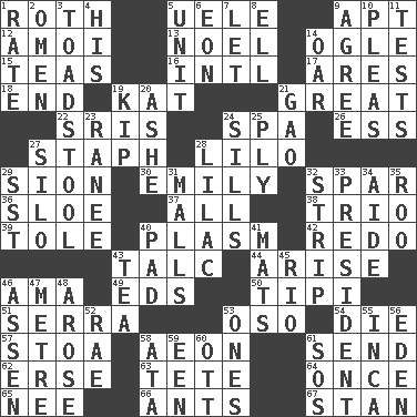 ACROSS 1. Writer of Portnoy's Complaint (1969) 5. Ubangi River tributary 9. Fitting 12. Mine, in Marseilles 13. Christmas carol 14. Stare 15. Beverages made from leaves 16. International (abbr.) 17. Ancient Greek god of war 18. Conclude 19. Krazy ___ of comics 21. Relatively large 22. Indian titles of respect 24. Health resort 26. Double-curved letter 27. Staphylococcus 28. _ and Stitch 29. The Jewish people; Israel 30. Poet Dickinson 32. Practice fight 36. _ gin 37. Everything 38. Musical group of three 39. Lacquered or enameled metalware 40. Suffix with ecto or cyto 42. Redecorate 43. Baby powder 44. Get up 46. Wet nurse (var.) 49. Begley and Asner 50. Native american tent (variation) 51. Father Junipero _ 53. Bear (Spanish) 54. Expire 57. Portico 58. A really long time 61. Post 62. Celtic language 63. Wig 64. At one time in the past 65. Born 66. Pismires 67. Comedian Laurel of Laurel & Hardy DOWN 1. Assign a rank or rating to 2. Sign of something about to happen 3. Inedible or poisonous agaric 4. Part of HMS, perhaps 5. A single undivided whole 6. Age 7. Allow 8. Pipe bend 9. Match 10. Entreaties 11. Trials 14. Rowing implement 19. Monetary unit of Laos 20. American tennis player Robert 21. E Mali city 23. The wife of a rajah (variant) 24. Beverly of Met fame 25. Apply oneself diligently 27. Grain storage tower 28. Pale purple color 29. Fast jet (abbr.) 31. Shopping centers 32. Empty completely 33. Elected leader of a country 34. Helper 35. Friend of Pooh 40. Groovy apt. 41. Floor protectors 43. Afternoon social gathering 45. River (Sp.) 46. NE Netherlands city 47. Distance measurement (Brit.) 48. Came up 52. Actress Charlotte 53. Singles 55. South American Indian 56. Paradise 58. "One Day ___ Time" 59. Car or cant ending 60. Baseball player Mel 61. Distress signal