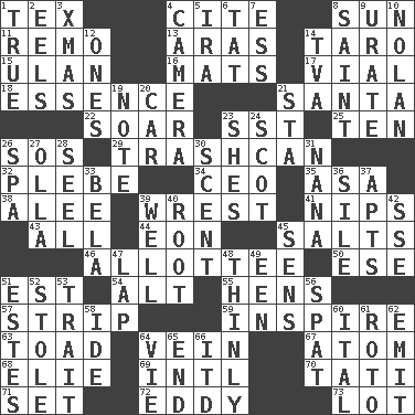 ACROSS 1. John Ritter's dad 4. Quote 8. Player for Phoenix 11. San ____ (Riviera town) 13. Caspian sea tributary 14. Pacific island yam 15. ____ Bator, Mongolia 16. Floor protectors 17. Small bottle 18. Core 21. Before Barbara or Clara 22. Fly high 23. Fast jet (abbr.) 25. Nine, plus one 26. Distress signal 29. File 13 32. First-year military academy student 34. Corporate head (abbr.) 35. White ___ sheet 38. Toward shelter 39. Take or capture by force 41. Pinches, bites 43. Everything 44. Age 45. Table seasonings 46. One to whom something is allotted 50. Compass dir. 51. Eastern Standard Time (abbr.) 54. The first octave above the treble staff 55. Coop moms 57. Long narrow piece of something 59. Motivate 63. Frog relative 64. Distinctive style or manner 67. Smallest unit of an element 68. Writer Wiesel 69. International (abbr.) 70. Jacques of French films 71. Arrange properly for use 72. Whirlpool 73. Car dealer's back yard DOWN 1. Loyal 2. Snakelike fish 3. Dec. holiday 4. Device for capturing images 5. Retirement account (abbr.) 6. Make lace 7. Curvy letter 8. Virtuous person 9. A salt of uric acid 10. Pitcher Ryan 12. Singles 14. Federal power corp. 19. Musical sound 20. 4-wheeled motor vehicle 21. R.R. building 23. "______ My Girl" (Turtles hit) 24. Native of Scotland 26. Health resort 27. Rounded earthenware pot or jar 28. Stitch closed the eyes of (a falcon) 30. Aroma 31. Grandmother 33. Actor Lugosi 36. Drop; flow; fall 37. Tenement units (abbr.) 39. Not ill 40. Carrot, for example 42. Compass dir. 45. Elected reps. 47. Pet locale 48. Without viscosity 49. Car or cant ending 51. _____ Park, CO 52. Fur scarf 53. Distinguishing feature 56. Petty quarrel 58. Binary compound 60. Slanted text style (abbr.) 61. Printing process, for short 62. Give off 64. Compete 65. Conclude 66. It would