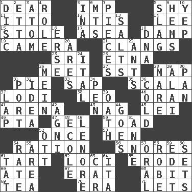 ACROSS 1. Letter starter 5. Mischievous child 8. Like a shrinking violet 11. "Tell ____ the Marines!" 12. Nuclear Threat Initiatives 14. Area sheltered from the wind 15. Took without asking 17. Toward the sea 18. Moist 19. Device for capturing images 21. Rings like a ship's bell 23. Indian title of respect (Mr.) 25. Inactive volcano in Sicily 26. Rendezvous 27. Fast jet (abbr.) 28. Atlas unit 31. Sliced dessert 33. Plant excrement 35. Any of the three canals of the cochlea 37. Farming town in central California 38. Lion 40. NW Algerian seaport 41. Sports stadium 43. Tired old horse 45. Luau accessory 46. Parent Teacher Assoc. 47. Set 50. Frog relative 52. Single time 53. Layer 54. Food allowance for one day 56. Sounds asleep 61. Small pie 62. Event scenes 65. Wear away 66. Had dinner 67. Part of Q.E.F. 68. "This won't hurt ____!" 69. Afternoon social gathering 70. Epoch 71. Allows DOWN 1. Plate 2. Singer James 3. Smallest unit of an element 4. Hero or heavy, e.g. 5. _ tizzy (2 wds.) 6. Mountains (abbr.) 7. Parts 8. Volcanic refuse 9. Cloth borders 10. Slangy assent 13. Table seasonings 16. Celtic language 18. Heredity factor (abbr.) 20. Ancient Greek god of war 22. Pismires 24. Slanted text style (abbr.) 26. Chow _ 28. Female horse 29. Jai ____ 30. Baking dish 31. Left side of a ship or aircraft 32. It may be bright or harebrained 34. Fenced enclosure 36. Having a low temperature 37. Pet locale 39. Pledge 42. Hindu god of fire 44. Travels 48. Learning spot: Fr. 49. Poe poem 51. Queen of England 1702-14 52. Baseball player Mel 54. Pace 55. Length times width 57. Taken by mouth 58. Loose flowing garment 59. Prepare for publication 60. Puts into a specified state 61. Make lace 63. 4-wheeled motor vehicle 64. Call ___ day