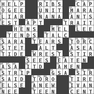 ACROSS 1. Assist 5. Chest bones 9. Head covering 12. Double curve, resembling the letter S 13. A single undivided whole 14. Hindu Mythology: god of death 15. One who doesn't tell the truth 16. Nanny 17. Pismires 18. Eastern Standard Time (abbr.) 19. Fitting 21. Distinguishing feature 22. Coop moms 24. Cartoonist voice _ Blanc 26. Area sheltered from the wind 27. Looks after 28. Baby powder 29. "Two Mules for Sister ____" 30. Separates forcefully 32. Torque (variant) 36. Proofreading order 37. The first octave above the treble staff 38. Toward the sea 39. Periodic rise and fall of the sea level 40. Take or capture by force 42. Agitate 43. Observes 44. Eroded 46. White ___ sheet 49. It would 50. So be it 51. Remove all contents or possession from 53. Girls' org. (abbr.) 54. Title for a knight 57. Alleged 58. "Corrida" creature 61. Become fatigued 62. Otherwise 63. Afresh 64. "Terrible" tsar 65. Born 66. Adolescent 67. Penny DOWN 1. Opening into or through something 2. The front part of a cuirass 3. Resembling or made to resemble leather 4. For each 5. Undersized animal 6. _ tizzy (2 wds.) 7. Storage container 8. R.R. building 9. Lessep's creation 10. Nick name for Arthur 11. Thick mixture 14. Spoil 19. Also 20. Inconspicuous attention getter 21. Affectionate concern, for short 23. Related on the mother's side 24. Shops 25. Raised railways 27. Jacques of French films 28. Falsehoods 29. Fast jet (abbr.) 31. Having ears or earlike features 32. Clothes sense 33. Clearly or manifestly demonstrative 34. It's straight from the horse's mouth 35. 4-wheeled motor vehicle 40. Soggy 41. Beverages made from leaves 43. Small drink 45. Wet nurse (var.) 46. NE Netherlands city 47. Lacking originality or spontaneity 48. Get up 52. Binary compound 53. Long dress 55. SW Asia republic 56. Monthly bill 58. Make lace 59. Single 60. To separate or throw off 61. Nervous spasm