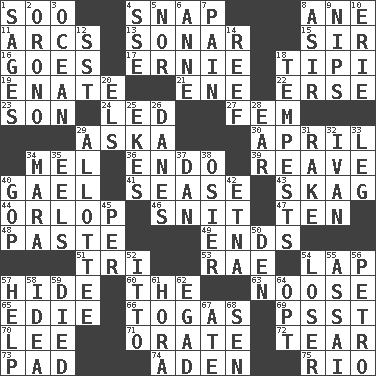 ACROSS 1. "Barney Miller" actor Jack 4. Fastener 8. A saturated hydrocarbon 11. Arches 13. Echolocation 15. Title for a knight 16. Leaves 17. Bert's buddy 18. Native american tent (variation) 19. Maternal 21. Compass dir. 22. Celtic language 23. Male offspring 24. Directed 27. Opposite of masc. 29. "____ silly question..." 30. Showery time 34. Cartoonist voice _ Blanc 36. Inside; within (prefix) 39. Break or tear apart 40. Highlander 41. Gospel singer Marvin 43. Heroin 44. Fourth or lowest deck 46. In a ____ (agitated or irritated) 47. Nine, plus one 48. Thick mixture 49. Extremities 51. Three (prefix) 53. Actress Charlotte 54. Infant locale 57. Flintstone garb 60. Definite Article 63. Trap for birds or small mammals 65. Singer Brickell 66. Ancient Roman robes 69. Inconspicuous attention getter 70. Area sheltered from the wind 71. Speak pompously 72. Pull apart 73. Writing tablet 74. Arabian gulf 75. _ de Janeiro DOWN 1. Gurus 2. U. of Maine site 3. Sea 4. Compass dir. 5. Or not 6. Queen of England 1702-14 7. Ache 8. SW Saudi Arabia district 9. Cuts off 10. 4th largest of the Great Lakes 12. Fast jet (abbr.) 14. Coral collection 18. Storms 20. Raised railways 25. Makes supply last 26. Natives or inhabitants of Denmark 28. Hearing organ 29. One to whom something is allotted 31. Immoral or dissolute person 32. _ the terrible 33. Part of a journey 34. Hindu Mythology: god of death 35. Snakelike fish 37. Daniel's nick name 38. Flexible twig of a willow tree 40. Grand Old Party 42. Inactive volcano in Sicily 45. For each 50. Lair 52. "Tell ____ the Marines!" 54. Failure 55. Slender Brazilian palm 56. Stone: prefix 57. Assist 58. The main thing one is thinking about 59. Passed on 61. Israeli folk dance 62. Mild oath 64. Choose 67. Had dinner 68. Elected rep.
