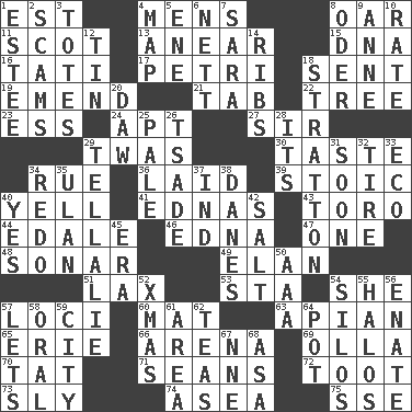 ACROSS 1. Eastern Standard Time (abbr.) 4. Not women's 8. Rowing implement 11. Highlander 13. Approach 15. Heredity factor (abbr.) 16. Jacques of French films 17. _ dish (used to culture cells) 18. Posted 19. Make improvements or corrections to 21. Bar bill 22. Relationship diagram 23. Curvy letter 24. Fitting 27. Title for a knight 29. It was, poetically 30. Clothes sense 34. Sorrow 36. Put down 39. Unemotional 40. Shout 41. Ferber et al. 43. "Corrida" creature 44. Peak District village in England 46. Pulitzer Prize-winning author Ferber 47. Single 48. Echolocation 49. Style 51. Not strict 53. R.R. building 54. A female animal or person 57. Locales 60. Floor protector 63. Bee-related 65. 4th largest of the Great Lakes 66. Sports stadium 69. Spanish pot 70. Make lace 71. Actors Connery and Penn 72. A blast of a horn 73. Playfully artful 74. Toward the sea 75. Compass dir. DOWN 1. First name in cosmetics 2. Fraudulent business schemes 3. Lugs 4. Atlas unit 5. Compass dir. 6. Remaining after all deductions 7. "Two Mules for Sister ____" 8. Baltic tributary 9. Singer Murray 10. Pace 12. Shallow baking pan 14. Teases 18. Ski resort town in Vermont 20. Fool 25. Diluted with white 26. Sadhe (variant) 28. ___ a Wonderful Life 29. Copy Pinocchio 31. Within a short period 32. Hoop that covers a wheel 33. Environmental prefix 34. Make new 35. Uhlan (variant) 37. Working for oneself (abbr.) 38. Natives or inhabitants of Denmark 40. It is so 42. Table seasoning 45. Period 50. Auto club (abbr.) 52. Dec. holiday 54. Grain storage towers 55. Saint headwear 56. Related on the mother's side 57. Allows 58. Taken by mouth 59. Municipality 61. Length times width 62. Beverages made from leaves 64. Plant holder 67. Compass dir. 68. White ___ sheet