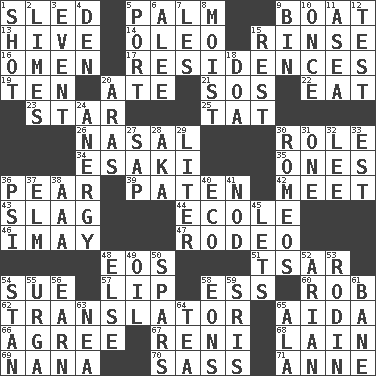 ACROSS 1. Downhill vehicle 5. Inside of hand 9. Water vessel 13. Hub of activity 14. Butter sub 15. Remove soap 16. Sign of things to come 17. Homes 19. Nine, plus one 20. Had dinner 21. Distress signal 22. Ingest 23. Play the lead 25. Make lace 26. Relating to the nose 30. Hero or heavy, e.g. 34. 1973 Nobel Price Winner (Physics) Leo 35. Washington bills 36. Lightbulb-shaped fruit 39. Eucharist need 42. Rendezvous 43. Volcanic refuse 44. Learning spot: Fr. 46. "If ____ say so..." 47. Cowboy competition 48. Greek goddess of the dawn 51. Russian ruler of old 54. Institute legal proceedings 57. Mouth edge 58. Double-curved letter 60. Director Reiner 62. Interpreter 65. Opera by Verdi 66. Match 67. Painter Guido (1575-1642) 68. (Had) reclined 69. Nanny 70. Backtalk 71. Singer Murray DOWN 1. Attempt 2. Citrus fruits 3. Happening 4. Lair 5. Left side of a ship or aircraft 6. Toward shelter 7. French article 8. Wet 9. Storage container 10. Single time 11. At sea 12. Trial 15. Respite 18. ___ good deed 20. Ancient river in northeast Turkey 24. Disorder of the immune system 27. Plant excrement 28. Alias (abbr.) 29. 61 cubic inches 30. Lover boys 31. Single 32. Area sheltered from the wind 33. Eastern Standard Time (abbr.) 36. 23rd letter of the Greek alphabet 37. Shade tree 38. American Automobile Association (abbr.) 40. Environmental prefix 41. Allow head to fall sleepily 45. Allows 48. Otherwise 49. Petroleum 50. Practice fights 52. Believer in; advocate of (suffix) 53. "The Thinker" sculptor 54. Comedian Laurel of Laurel & Hardy 55. Capital and largest city of Mongolia 56. Merit 58. Immeasurably long periods of time 59. Indian titles of respect 61. Object of repulsion 63. Teachers' org. 64. Afternoon social gathering 65. Chicken ___ king