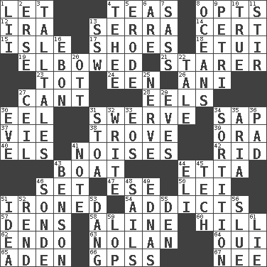 ACROSS 1. Allow 4. Beverages made from leaves 8. Chooses 12. Lyricist Gershwin 13. Father Junipero _ 14. Certainty 15. Capri or Wight 17. Imelda's hoard 18. Needle case 19. Turned at an angle; bent 21. A viewer who gazes fixedly 23. Small child 24. Car or cant ending 26. Cuckoo 27. Patter 28. Snakelike fish 30. Snakelike fish 31. Turn aside suddenly 34. Plant excrement 37. Compete 38. Collection of objects 39. Mouth or opening 40. Raised railways 41. Annoying sounds 42. To free from 43. Water vessel 44. Singer James 46. Put into a specified state 47. Compass dir. 50. Luau accessory 51. Pressed 54. Inveterate users 57. Hiding places for outlaws 58. Place in a line 60. Land elevation 62. Inside; within (prefix) 63. Pitcher Ryan 64. Fr. "Yes" 65. An important port of Yemen 66. Global Positioning Systems (abbr.) 67. Born DOWN 1. Cards in a Roman deck? 2. Celtic language 3. Baron Munchausen's specialties 4. Giggle 5. Eat (away) 6. "We ___ not amused" (Victoria) 7. Backtalk 8. Seas 9. _ dish (used to culture cells) 10. Loyal 11. Use a swizzle stick 13. Compass dir. 16. Inky black, to poets 20. Baseball player Mel 22. Story 25. Effrontery 27. To provide with a ceiling 29. Nights before holidays 30. First lady 31. Portico 32. Compose 33. Greek goddess of the dawn 34. Drawing lots 35. Operatic vocal solo 36. Groovy apt. 41. Brief written record 43. Gillaume's butler role 44. Biblical high priest 45. Technology 46. Message 48. Travel by water 49. Ferber et al. 51. The content of cognition 52. Tear apart 53. Mild oath, euphamism for damn 55. Lair 56. Change direction abruptly 59. Chop off 61. Whopper