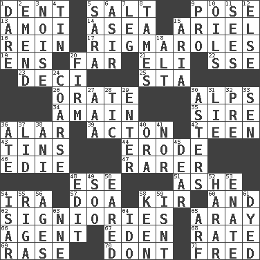 ACROSS 1. Scratch 5. Table seasoning 9. Introduce or present, as a question 13. Mine, in Marseilles 14. Toward the sea 15. Satellite of Uranus 16. It's straight from the horse's mouth 17. Complicated, petty procedures 19. Followers of ems 20. Distant 21. Connecticut Ivy Leaguer 22. Compass dir. 23. Tenth: prefix 25. R.R. building 26. Declaim 30. High mountains 34. With great haste 35. Father 36. Having or resembling wings 39. NE Massachussets city 42. Adolescent 43. Metal containers 44. Wear away 46. Singer Brickell 47. More valued for its uncommonness 48. Compass dir. 51. American tennis player Robert 54. Retirement account (abbr.) 57. ___ good deed 58. Apertif with cassis 60. Added to 62. Seigniories (variant) 65. Like ___ of sunshine 66. Representative 67. Paradise 68. Pace 69. To erase 70. Do not 71. Flintstone DOWN 1. Have the gumption 2. Make improvements or corrections to 3. Annoying sound 4. Metal container 5. "Two Mules for Sister ____" 6. SW Saudi Arabia district 7. Part of a journey 8. Corrects by punishment or discipline 9. Adept person 10. Lubricates 11. Observes 12. Otherwise 15. Operatic vocal solo 18. Keyboard modifier key 20. Become taut 24. Unrefined 27. American Automobile Association (abbr.) 28. Nervous spasm 29. Keyboard key 30. Michaelmas daisies 31. Whopper 32. Before (prefix) 33. Elected rep. 36. Had dinner 37. Hat (slang) 38. Black tropical American cuckoo 40. Mouth or opening 41. Or not 45. Letter starter 48. Prepare for publication 49. "Barney Miller" actor Jack 50. Having ears or earlike features 52. Ethiopian city, capital of Harari 53. Maternal 54. Austrian river, tributary to the Danube 55. Port city in Latvia 56. Matures 58. Peachy ____! 59. Is not 61. Colored 63. Compass dir. 64. Wedding promise 65. Sandy's bark