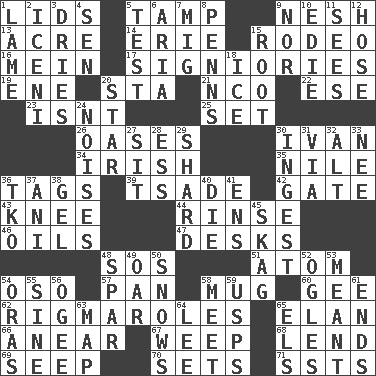 ACROSS 1. Hats (slang) 5. Pack (down) 9. Tender 13. 43,560 square feet 14. One of the Great Lakes 15. Cowboy competition 16. Chow _ 17. Seigniories (variant) 19. Compass dir. 20. R.R. building 21. Non-commissioned officer (abbr.) 22. Compass dir. 23. Is not 25. Arrange properly for use 26. Fertile tracts in a desert 30. "Terrible" tsar 34. From or relating to Ireland 35. Mediterranean tributary 36. Labels 39. Sadhe (variant) 42. Yard entry 43. Leg joint 44. Wash lightly 46. Lubricates 47. Writing tables 48. Mayday 51. Smallest unit of an element 54. Bear (Spanish) 57. Baking dish 58. Large cup 60. Unit of force equal to gravity 62. Complicated, petty procedures 65. Style 66. Approach 67. Shed a tear 68. Grant temporary use of 69. Ooze 70. Arranges properly for use 71. Fast planes DOWN 1. Unable to walk 2. Ancient Celtic tribe of eastern Britain 3. Frees from moisture 4. Elected rep. 5. Trial 6. Operatic vocal solo 7. Russian fighter aircraft 8. Actor Sean's family 9. Not either 10. Singer Brickell 11. Perceives with the eye 12. Stockings 15. Carrot, for example 18. Frozen water 20. Play the lead 24. Annoying sounds 27. Be seated 28. Curvy letter 29. Pottery fragment 30. Consume 31. By way of 32. Keyboard modifier key 33. Born 36. Ring climax 37. Cuckoo 38. Set 40. Pass on 41. Followers of ems 45. Heroin 48. Coast Guard woman 49. Boat paddle 50. Frozen precipitation (plural) 52. Stares 53. Intended 54. Mouths or openings 55. Trig term 56. Double curve, resembling the letter S 58. Rendezvous 59. United States Postal Service (abbr.) 61. Conclusions 63. Atlas unit 64. Area sheltered from the wind 65. Raised railways