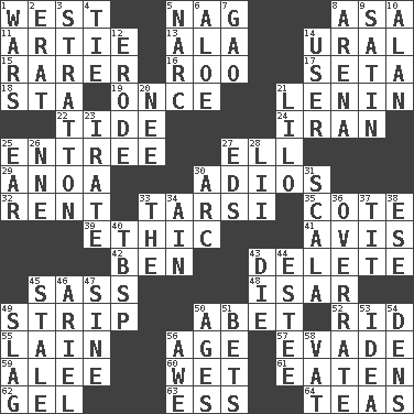 ACROSS 1. Compass direction 5. Tired old horse 8. White ___ sheet 11. Nick name for Arthur 13. In the manner of 14. Mountain range 15. More valued for its uncommonness 16. Friend of Pooh 17. Bristle 18. R.R. building 19. Single time 21. Soviet premier 1918-24 22. Periodic rise and fall of the sea level 24. SW Asia republic 25. Main course 27. Pipe bend 29. Small Philippine buffalo 30. Goodbye (Sp.) 32. Monthly bill 33. Tarsus (plural) 35. ____ d'Azur (French Riviera) 39. Moral principle 41. Opinion 42. Benjamin's nick name 43. Erase 45. Backtalk 48. Austrian river, tributary to the Danube 49. Remove all contents or possession from 50. Collude with 52. To free from 55. (Had) reclined 56. Mature 57. Dodge 59. Toward shelter 60. Dripping 61. Consumed 62. Set 63. Curvy letter 64. Afternoon social gatherings DOWN 1. Armed conflicts 2. Part of Q.E.F. 3. Ski resort town in Vermont 4. Make a knot 5. Drug cop 6. Medicinal plant 7. E Mali city 8. Sports stadium 9. Smooth fabric 10. ____ Jay Lerner 12. Wear away 14. One who makes use of a thing 20. Born 21. _ and Stitch 23. Feeling or showing extreme anger 25. Ewer handle 26. Compass dir. 27. Begley and Asner 28. Cards in a Roman deck? 30. Curve 31. Any of the three canals of the cochlea 33. Definite Article 34. The 18th letter of the Arabic alphabet 36. Make much ado about nothing 37. Teat (slang) 38. Compass dir. 40. Cook's measure (abbr.) 43. Pass on 44. First name in cosmetics 45. Showing deterioration from age 46. Satellite of Uranus 47. Trig term 49. Volcanic refuse 50. Ripens 51. Wagers 53. The main thing one is thinking about 54. Cub Scout units 56. Deep reverence 58. Large container