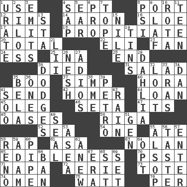 ACROSS 1. Purpose 4. Back-to-school mo. 8. Sweet dark-red dessert wine 12. Basketball hoops 14. Composer Copland 16. A type of plum 17. Came down and settled, as after flight 18. Appease 20. Add up to 22. Connecticut Ivy Leaguer 23. Air blower 24. Curvy letter 25. _ tizzy (2 wds.) 28. Conclusion 30. Passed on 31. First course 35. Sometimes accompanies a hiss 37. Simple or foolish person 40. Israeli folk dance 41. Transmit 42. Homing pigeon 44. Grant temporary use of 45. Cassini of fashion 46. Bristle 47. ___ a Wonderful Life 48. Fertile tracts in a desert 50. Port city in Latvia 52. Ocean 54. Single 55. Had dinner 58. Hit sharply and swiftly 61. White ___ sheet 63. Pitcher Ryan 65. The property of being fit to eat 70. Inconspicuous attention getter 71. California wine valley 72. Nest on high 73. Haul 74. Sign of things to come 75. Electrical Unit 76. For each DOWN 1. A salt of uric acid 2. Grain storage towers 3. Gives off 4. Plant excrement 5. Ewer handle 6. Adept person 7. Drink excessively 8. Air pressure measure (abbr.) 9. Norwegian king 10. Round or rotation of duties 11. Adolescent 13. R.R. building 15. "Death on the ____" 19. Airtight sealed metal containers 21. Cards in a Roman deck? 26. Delicate 27. Goodbye (Sp.) 29. A pale violet or amethyst color 30. Evades 32. Spoils 33. Caspian sea tributary 34. Daniel's nick name 35. Actor Lugosi 36. Singles 38. Madame (abbr.) 39. Stone: prefix 41. "Barney Miller" actor Jack 43. Water falling in drops from the sky 49. Lick closed 51. Commissioned military rank (abbr.) 53. At sea 55. Columnist Joseph or Stewart 56. Clothes sense 57. Keyboard key 58. Former U.S. Attorney General Janet 59. First man 60. Corncob 62. Afresh 64. Elect 66. Forbid 67. Epoch 68. Be seated 69. Arrange properly for use