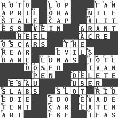ACROSS 1. Printing process, for short 5. Trim (branches) 8. Air blower 11. Showery time 13. Mouth or opening 14. Mediterranean tributary 15. Having lost freshness 16. Head covering 17. Came down and settled, as after flight 18. Curvy letter 19. Distinctive style or manner 21. Monetary aid 22. The bottom of a shoe or boot 24. Measure of real estate 25. Motion picture awards 27. Definite Article 29. Located in or toward the back 30. Vices 32. Object of repulsion 33. Ferber et al. 35. Lug 39. Administered medicine 41. "Terrible" tsar 42. Writing instrument 43. Erase 45. Son of Isaac 48. One who uses or employs something 49. Thick slices 50. Slit 52. To free from 55. Singer Brickell 56. Wedding promise 57. Elude 59. Portable shelter 60. 4-wheeled motor vehicle 61. Eroded 62. Tate display 63. Make supply last 64. Afternoon social gatherings DOWN 1. Raze (variant) 2. Elects 3. File 13 4. Lubricate 5. Locales 6. Northwest Algerian city 7. Infant food 8. Of or pertaining to a thread or threads 9. Place in a line 10. Remaining after all deductions 12. Crowbar 14. Drug cop 20. Raised railways 21. Highlander 23. Having ears or earlike features 25. Globe 26. Ocean 27. Federal power corp. 28. Part of HMS, perhaps 30. Conclude 31. Vertical member of a panel or frame 33. Compass dir. 34. Lair 36. Make much ado about nothing 37. Make lace 38. Compass dir. 40. Musical composition 43. Superhero pair 44. First name in cosmetics 45. A person who is older than you are 46. Inhabitant of Heaven 47. Collude with 49. Bristle 50. Neighbor of Neb. 51. Old wives' tales, e.g. 53. The main thing one is thinking about 54. Hiding places for outlaws 56. Frozen water 58. Large container