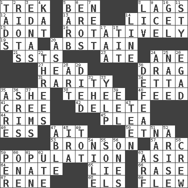 ACROSS 1. Long journey 5. Benjamin's nick name 8. Fails to keep up a pace 12. Opera by Verdi 13. "We ___ not amused" (Victoria) 14. It is permitted: Lat. 15. Do not 16. Rotating or pertaining to rotation 19. R.R. building 20. Choose not to consume 21. Fast planes 23. Had dinner 24. A saturated hydrocarbon 27. Froth on beer 30. To be drawn or hauled along 31. Noteworthy scarcity 34. Singer James 35. American tennis player Robert 38. Giggle 40. Nourish 41. Algonquian 42. Keyboard key 44. Basketball hoops 45. Entreaty 46. Double-curved letter 47. Small island 50. Inactive volcano in Sicily 53. "Death Wish" actor 57. Curve 59. Census information 63. SW Saudi Arabia district 64. Related on the mother's side 65. Untruth 66. To erase 67. French philosopher Descartes 68. Raised railways 69. Soared DOWN 1. Small boys 2. Disturbances 3. Ferber et al. 4. Krazy ___ of comics 5. Sharp remark 6. Greek god of love 7. Remaining after all deductions 8. 54 in ancient Rome 9. Adept person 10. Set 11. Filthy place 14. Actor's bit 17. Auto club (abbr.) 18. Teat (slang) 20. Toward the sea 22. Trios 24. Johnson of "Laugh-In" 25. Nathan's nickname 26. Mild oath 28. Nonscientific branch of learning 29. Passed on 30. Outscore 32. Definite Article 33. Sharp bark 35. 43,560 square feet 36. Indian titles of respect 37. Cloth borders 39. Snakelike fish 43. Adolescent 47. Competent 48. Lyricist Gershwin 49. Small child 51. Rhinal 52. Originate 54. Mediterranean tributary 55. Earth 56. Washington bills 58. Ship's personnel 59. For each 60. Single 61. Baking dish 62. Shoshoni 63. Sandy's bark