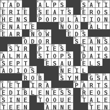 ACROSS 1. Small boy 4. High mountains 8. Suttee (variant) 12. One of the Great Lakes 14. Theater features 16. Greek god of love 17. Coop moms 18. Census information 20. Maternal 22. Allow head to fall sleepily 23. Keyboard modifier key 24. Ewer handle 25. Immediately 28. Begley and Asner 30. Scent 31. Actors Connery and Penn 35. Title for a knight 37. Sliced desserts 40. To the inside or interior of 41. _ mater 42. Discontinues 44. Raised platform 45. Back-to-school mo. 46. Son of Isaac 47. Raised railways 48. Goodbye (Sp.) 50. Famous astronaut Armstrong 52. Director Reiner 54. Symbol (abbr.) 55. Girls' org. (abbr.) 58. Allow 61. Lyricist Gershwin 63. Pieces 65. The property of being fit to eat 70. Vintage cars 71. Trig term 72. Woman's close-fitting hat 73. Story 74. Adolescent 75. Queen of England 1702-14 76. Nine, plus one DOWN 1. Giggle 2. Sports stadium 3. Middle Eastern gold or silver currency 4. Cleo's killer 5. Lion 6. Infant food 7. Surprise greatly 8. Put into a specified state 9. Operatic vocal solo 10. Implement 11. Is not 13. Eastern Standard Time (abbr.) 15. _ gin 19. Does sums 21. Conclude 26. I made a mistake 27. Compose 29. Beer mug 30. Speaker 32. Of or related to the anus 33. Nuclear Threat Initiatives 34. Mayday 35. Downhill vehicle 36. Body of Kaffir warriors 38. Greek goddess of the dawn 39. Connects, as a bridge 41. White ___ sheet 43. Chop _ 49. The visible part of the earth's surface 51. Mischievous child 53. Cy Young winner Saberhagen 55. Relatively large 56. Took without asking 57. NE Netherlands city 58. For fear that 59. Singer Brickell 60. Prong on a fork 62. Small Philippine buffalo 64. Tate display 66. Benjamin's nick name 67. Period of immesurable duration 68. Player for Phoenix 69. Observe