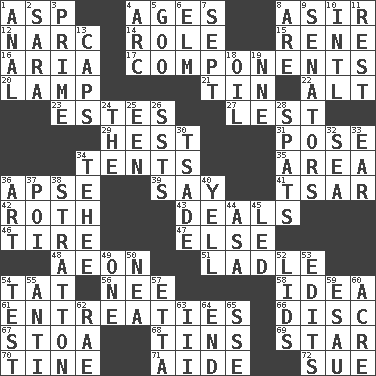 ACROSS 1. Cleo's killer 4. Eras 8. SW Saudi Arabia district 12. Drug cop 14. Hero or heavy, e.g. 15. French philosopher Descartes 16. Roberta Peters solo 17. Parts 20. Desk light 21. Metal container 22. The first octave above the treble staff 23. _____ Park, CO 27. For fear that 29. Behest 31. Airs 34. Portable shelters 35. Length times width 36. Domed church section 39. Declare 41. Russian ruler of old 42. Writer of Portnoy's Complaint (1969) 43. Allots cards 46. Hoop that covers a wheel 47. Otherwise 48. A really long time 51. Dipping utensil 54. Make lace 56. Born 58. The main thing one is thinking about 61. Pleas 66. Plate 67. Portico 68. Metal containers 69. Play the lead 70. Prong on a fork 71. Helper 72. Institute legal proceedings DOWN 1. Of or related to the anus 2. "Two Mules for Sister ____" 3. A-one 4. Curve 5. Thick or sticky substance 6. Shade tree 7. Back-to-school mo. 8. "We ___ not amused" (Victoria) 9. Elected representatives 10. International (abbr.) 11. Respite 13. Balmoral and tarboosh 18. Lubricate 19. Compass dir. 24. Definite Article 25. Car or cant ending 26. Fast planes 28. Arguments over trivial matters 30. Sadhe (variant) 32. Ocean 33. Hearing organ 34. Giggle 36. Nonscientific branch of learning 37. Luau course 38. Ski resort town in Vermont 40. Shout 44. White ___ sheet 45. Directed 49. Single 50. Teachers' org. 52. Hats (slang) 53. Prepares for publication 54. Trial 55. Opposed to 57. Singer James 59. He sold his birthright 60. 43,560 square feet 62. Actress Charlotte 63. One more than two 64. Conclude 65. Compass dir.